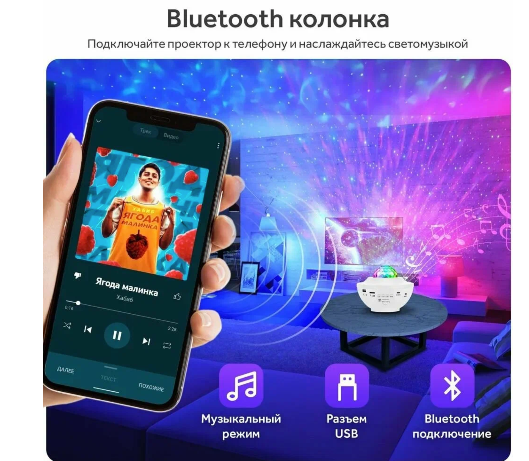 | Особенности | встроенный динамик / музыкальное сопровождение / смена цвета освещения |