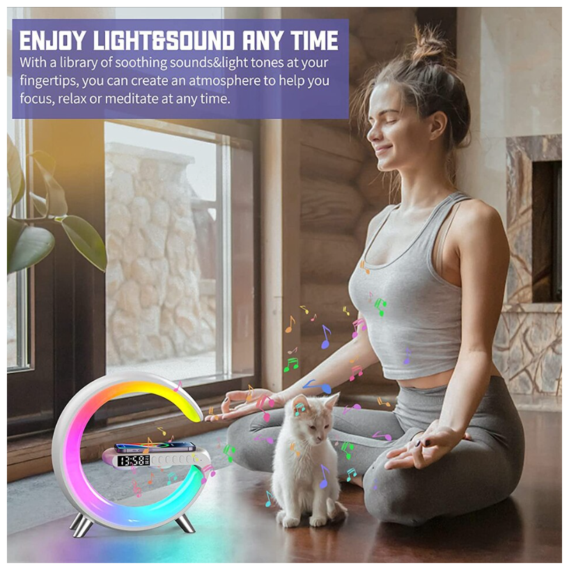 Ночник с беспроводной зарядкой, bluetooth-колонкой, часами и будильником. (белый)