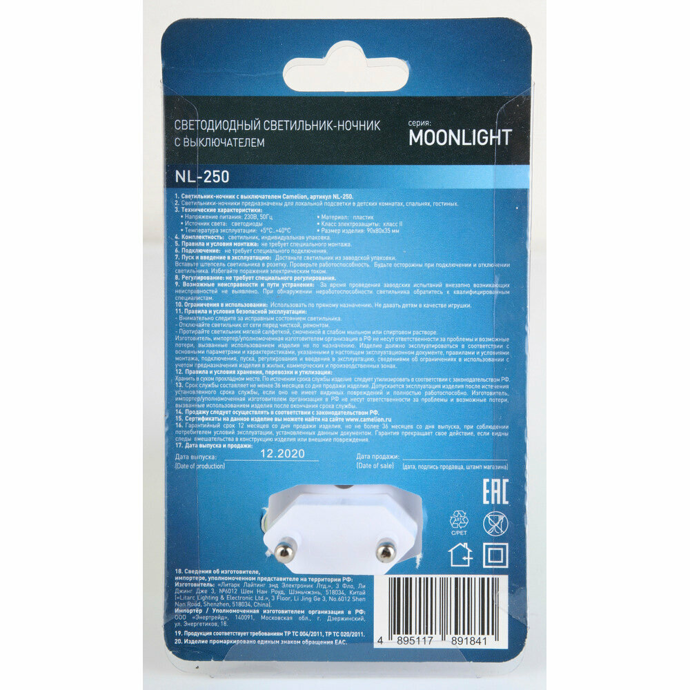 Ночник Camelion "NL-250", 1Вт, с выключателем, IP20, пластик