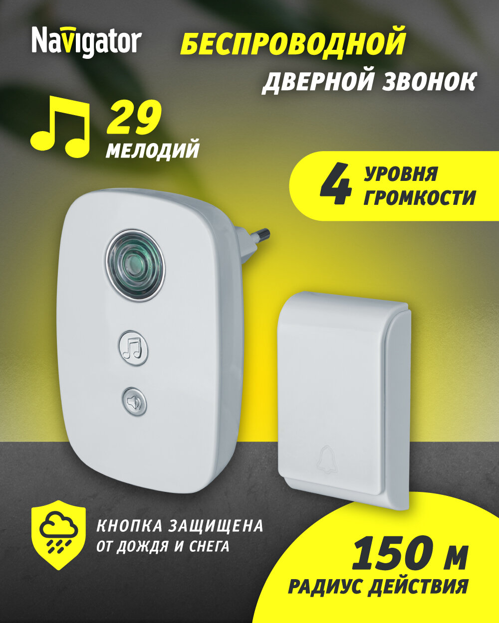 Звонок беспроводный Navigator 150 м, 29 мелодий 220V полиф-я, бел., кнопка IP47 NDB-D-AC02-1V1-WH 61270 электротовар интересное: