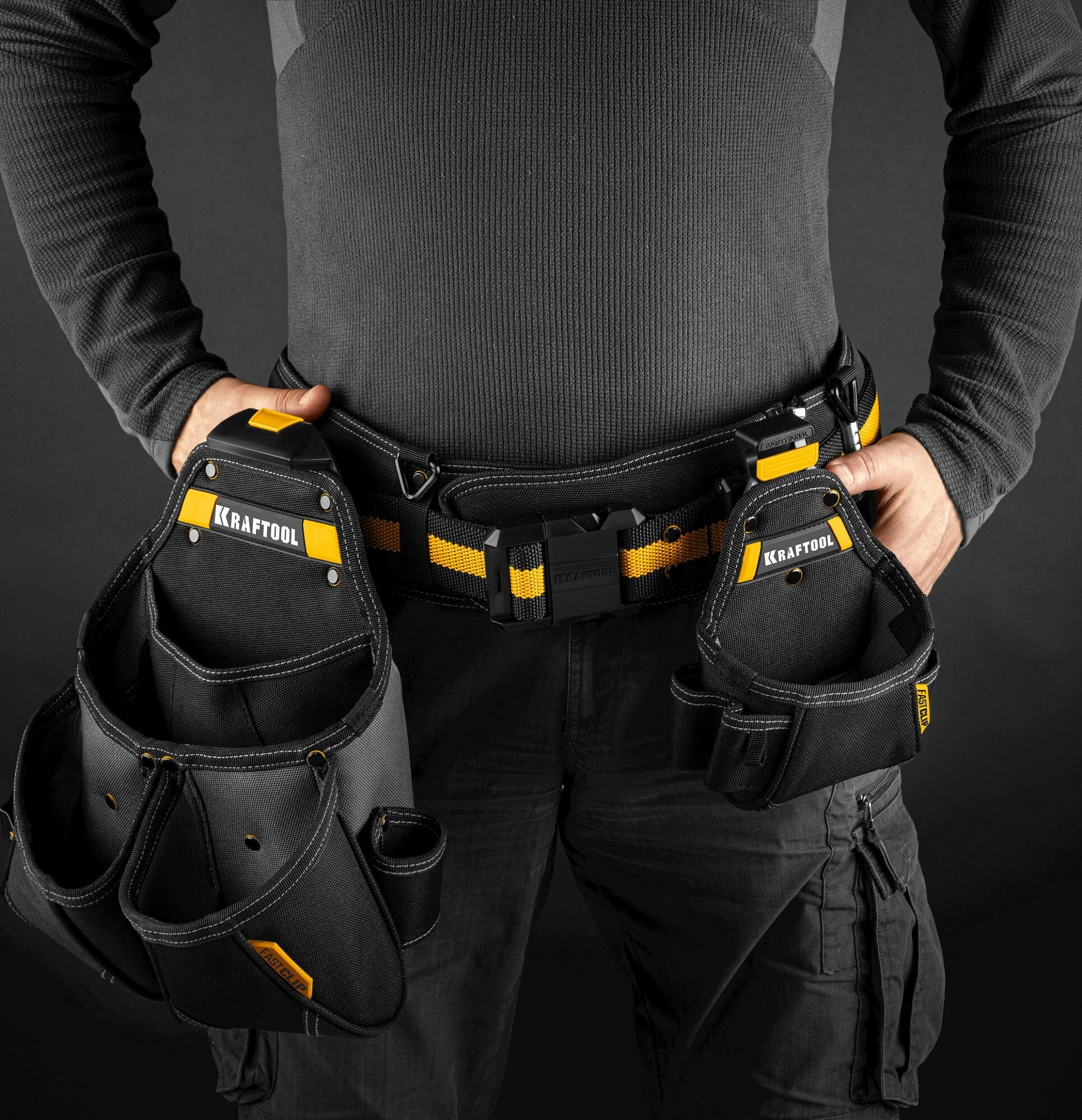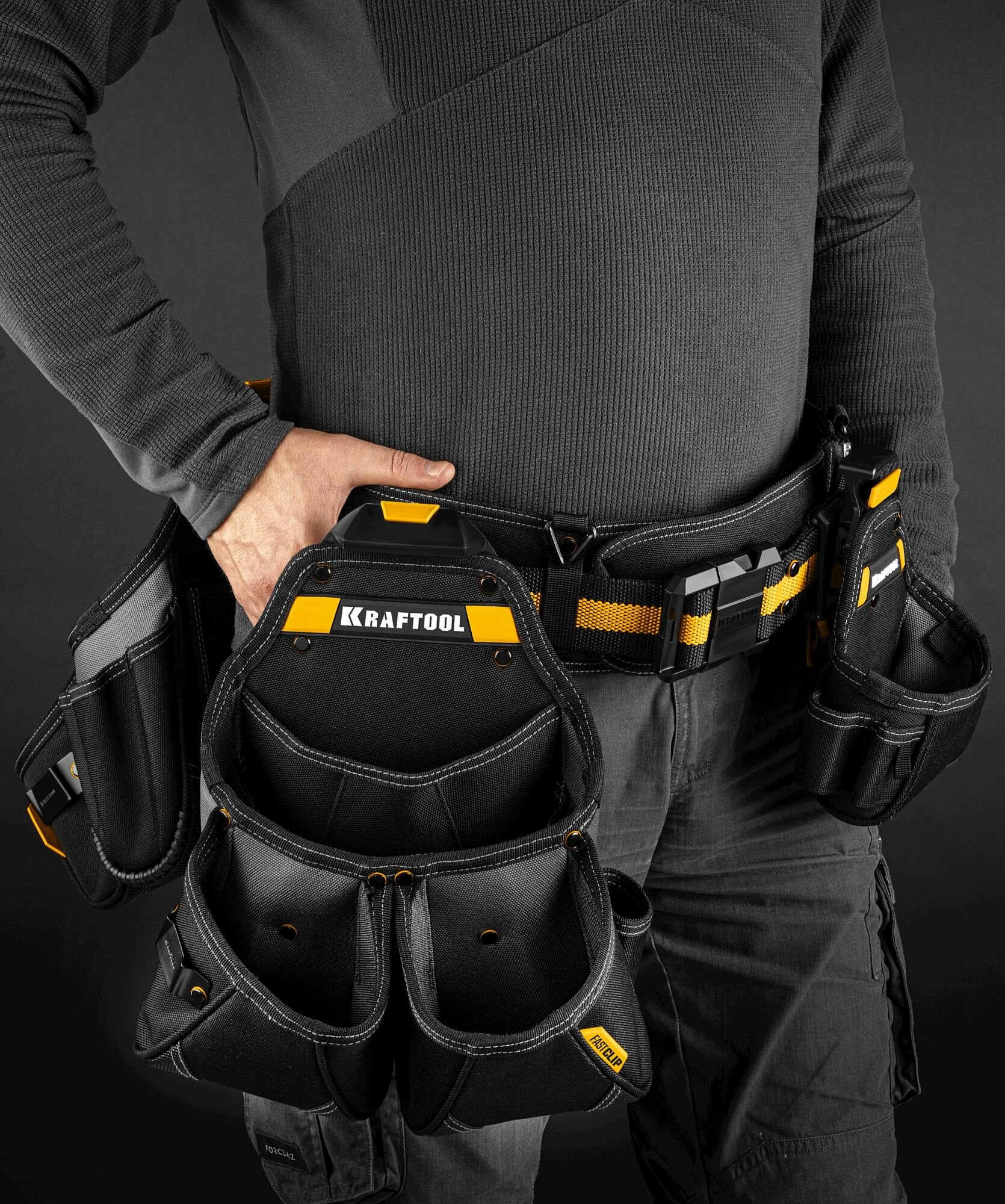 Поясная сумка KRAFTOOL KPB-23 с быстросъёмным креплением FastClip, плечевой ремень, 23 кармана и петли, 290 х 310 мм (38766)