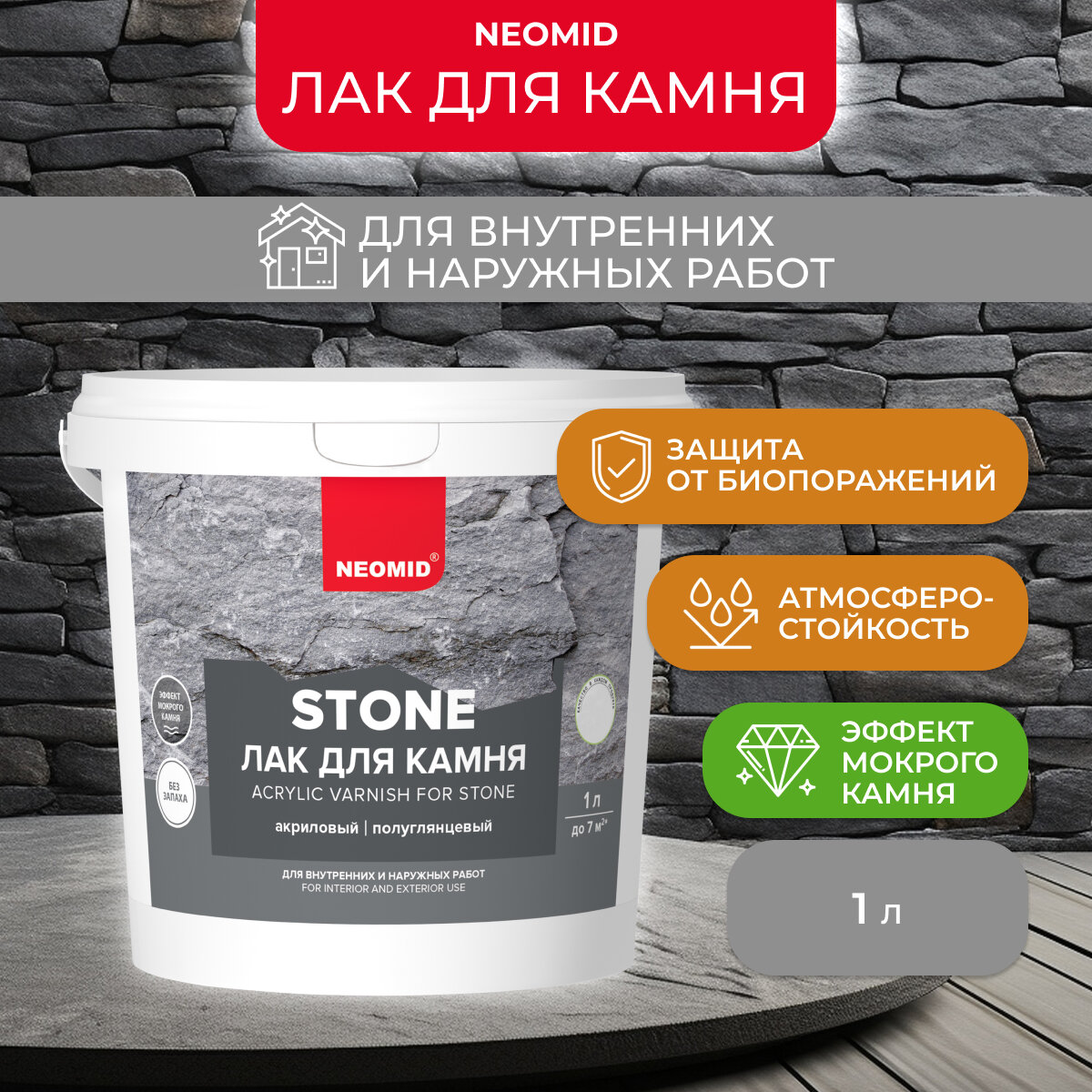 Неомид Stone (1 л) - защитный лак по камню, водорастворимый / С эффектом "мокрый камень"