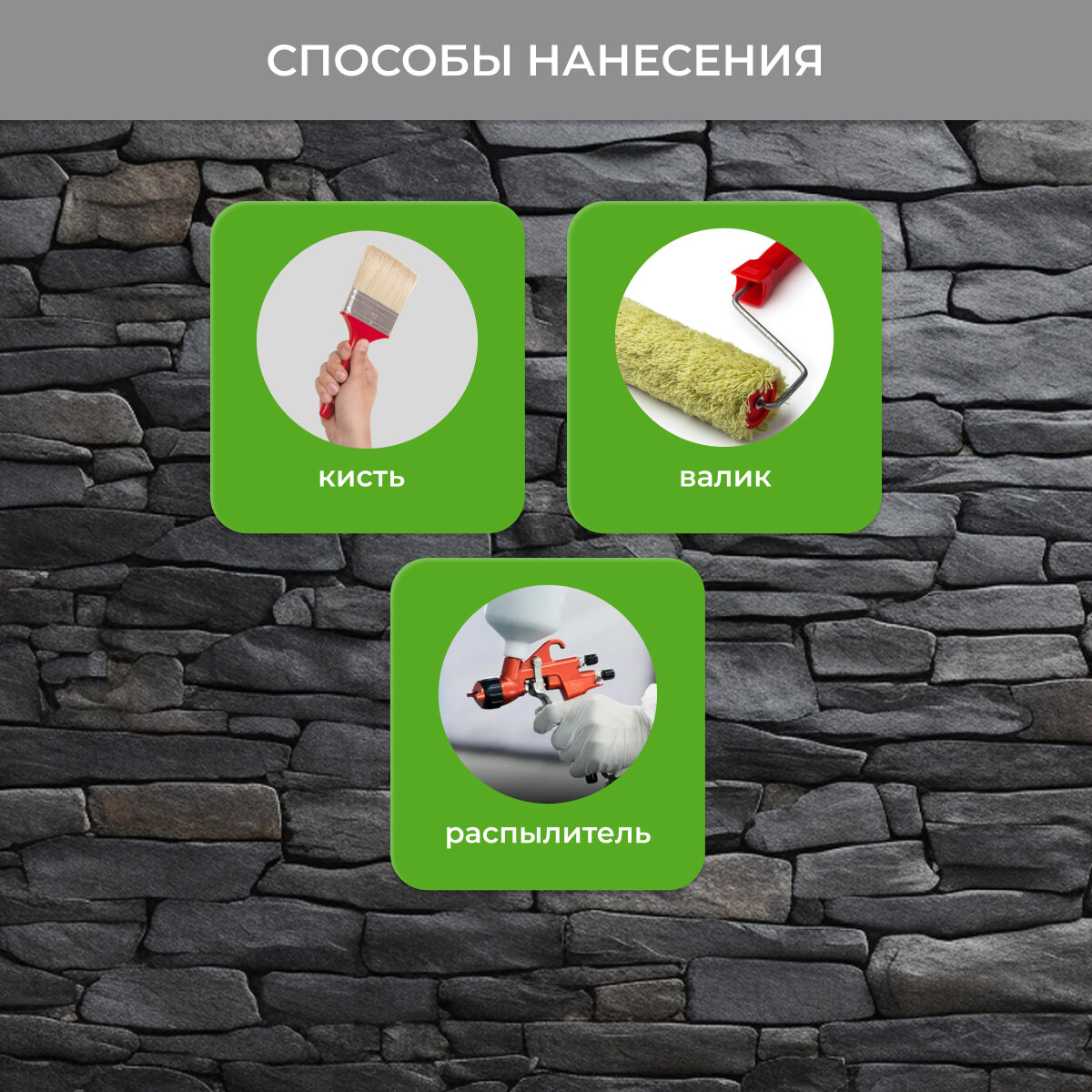 | Особенности | УФ-защита, без запаха, водостойкий, износостойкий, с эффектом мокрого камня, термостойкий |