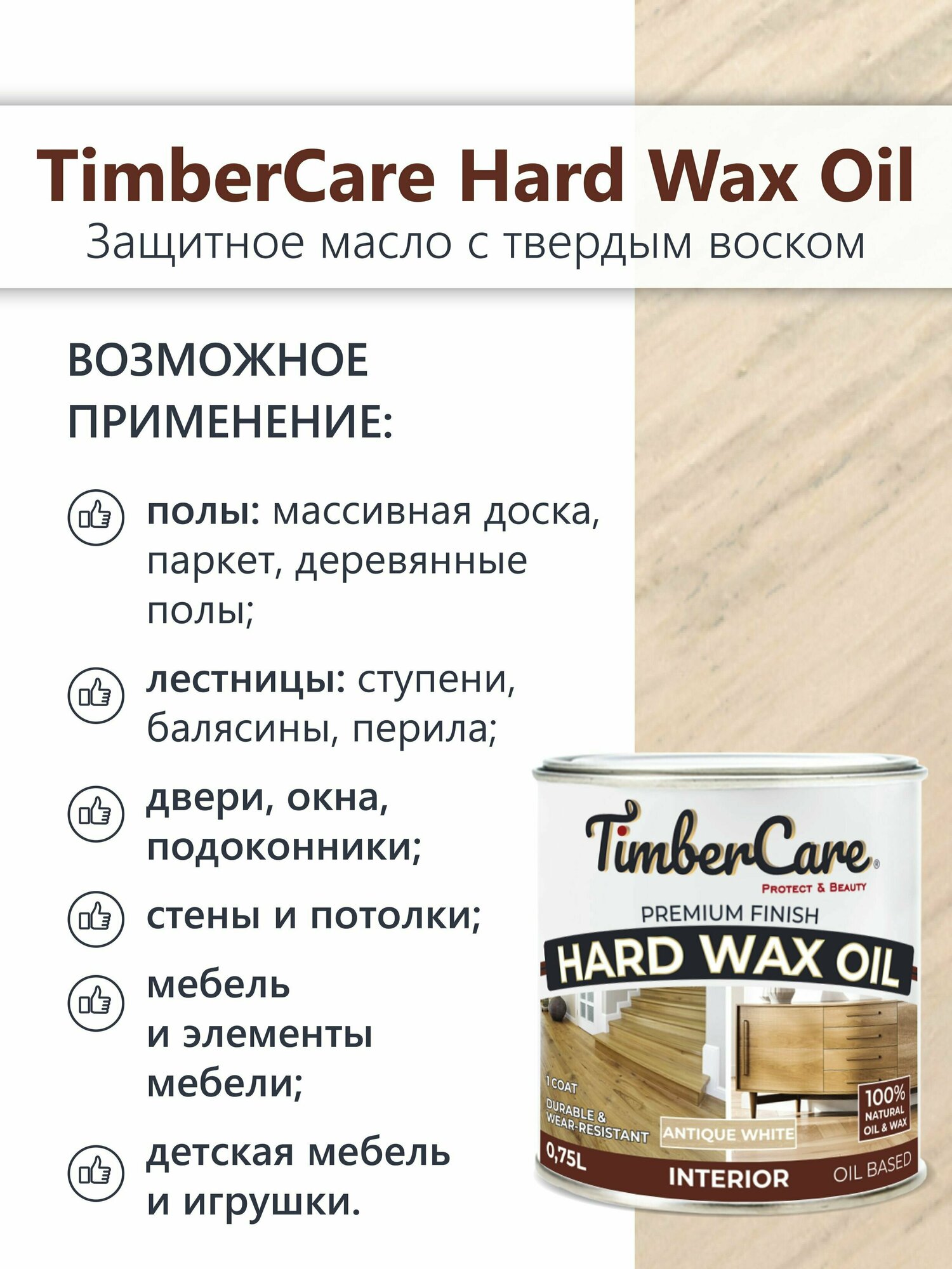 Масло для дерева и мебели TimberCare Wood Stain, быстросохнущие масла для дерева для внутренних работ, Античный белый / Warm Antique, 0.75 л