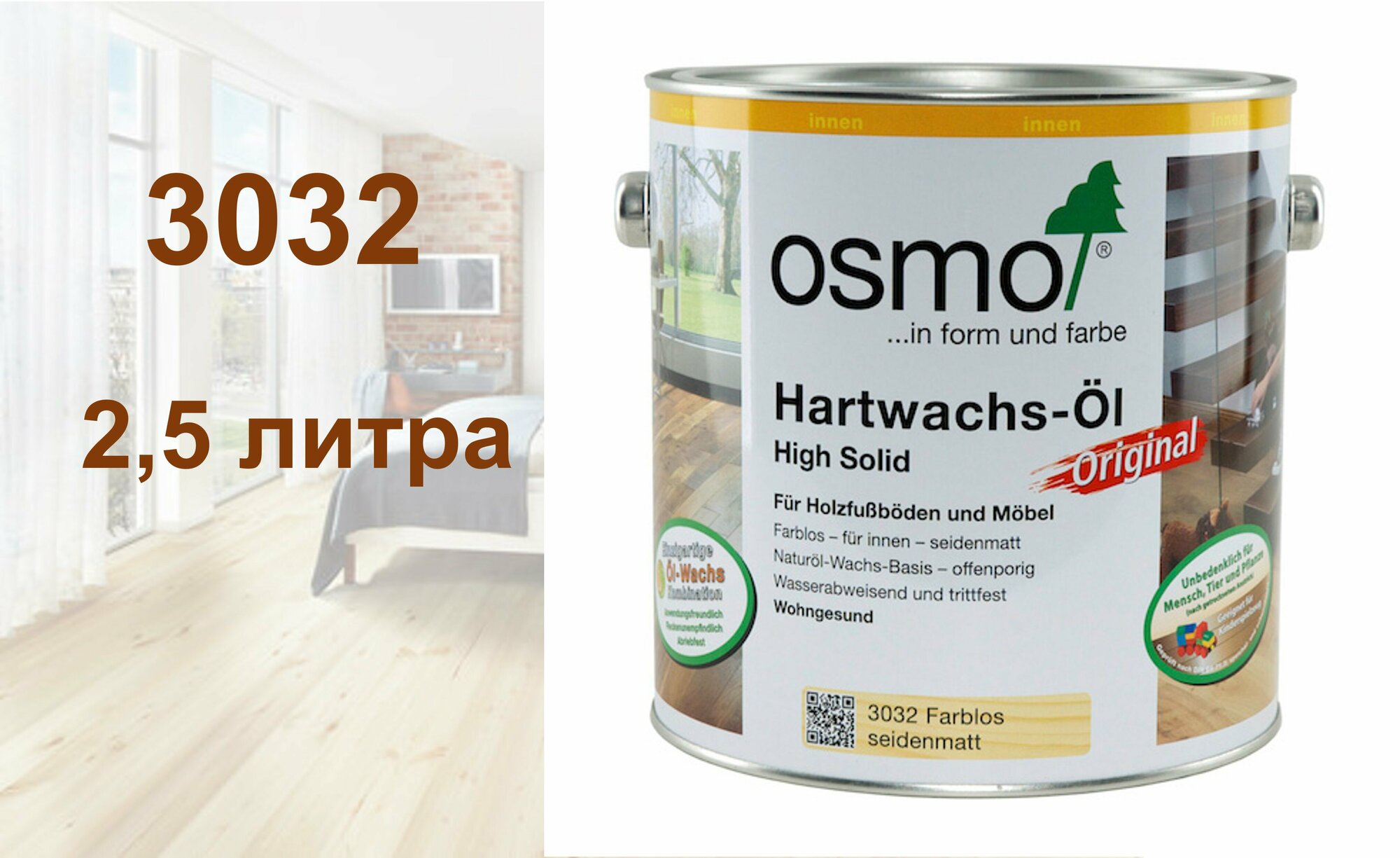 Масло Osmo Original 3032 для деревянных полов и мебели с твердым воском бесцветное шелковисто-матовое 2,5 л