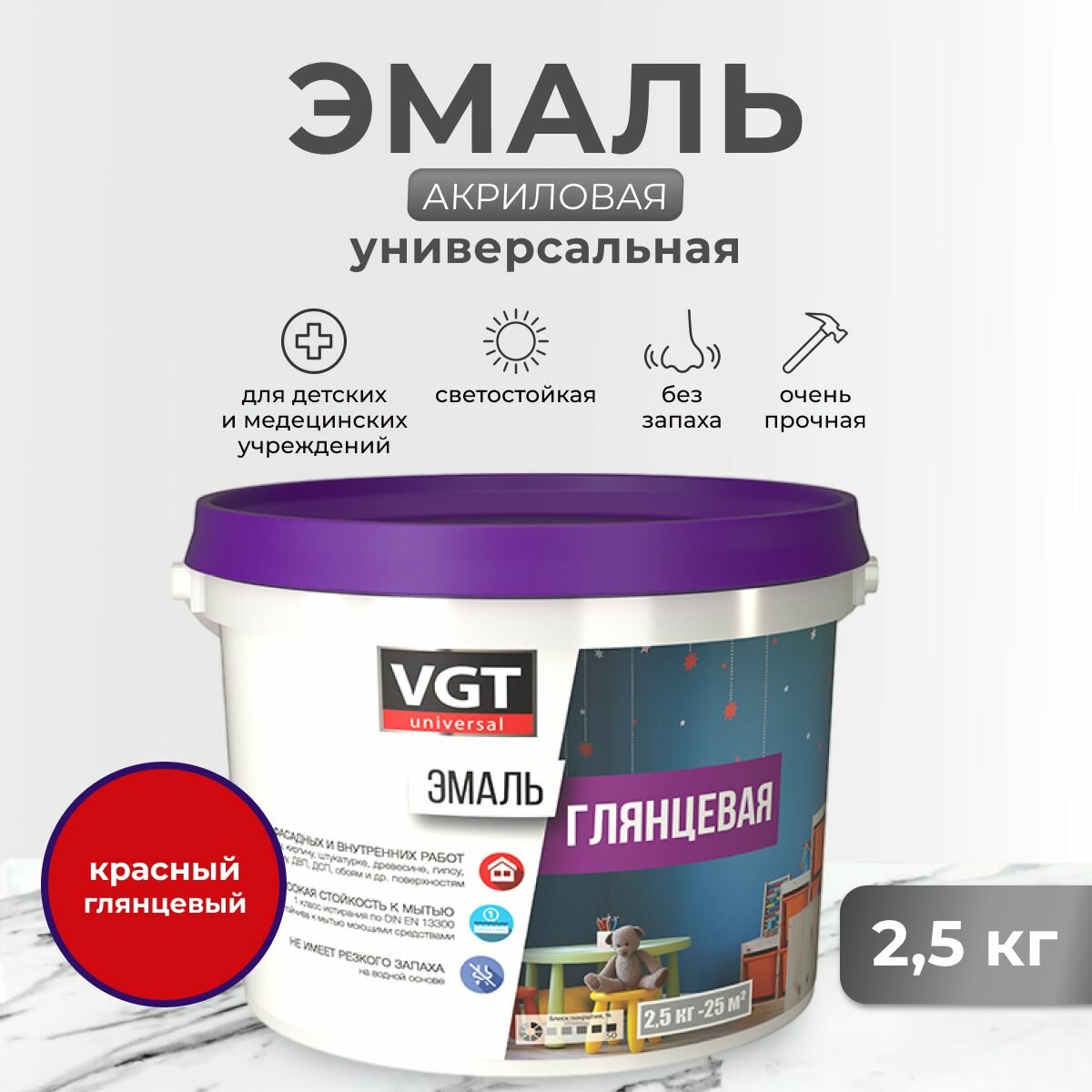 Эмаль Универсальная Акриловая VGT ВД-АК-1179 2.5кг Красная RAL3020 Глянцевая без Запаха для Внутренних и Наружных Работ / ВГТ Эмаль.