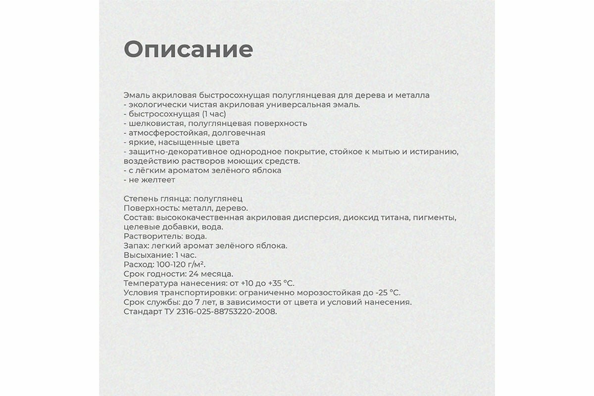 | Дополнительная информация | готова к применению, перед использованием перемешать, при необходимости разбавить водой или сольвентом не более 5%, наносить 1-2 слоя кистью, валиком, краскораспылителем при температуре от +5 до +35ºС и относительной влажности до 80% |