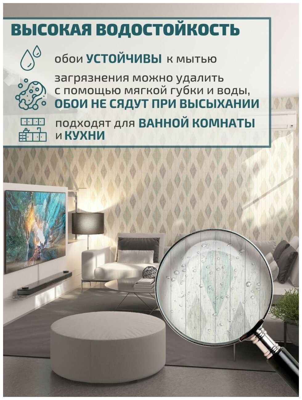 Обои виниловые на бумажной основе моющиеся Ромб для спальни, кухни, детской комнаты, гостиной
