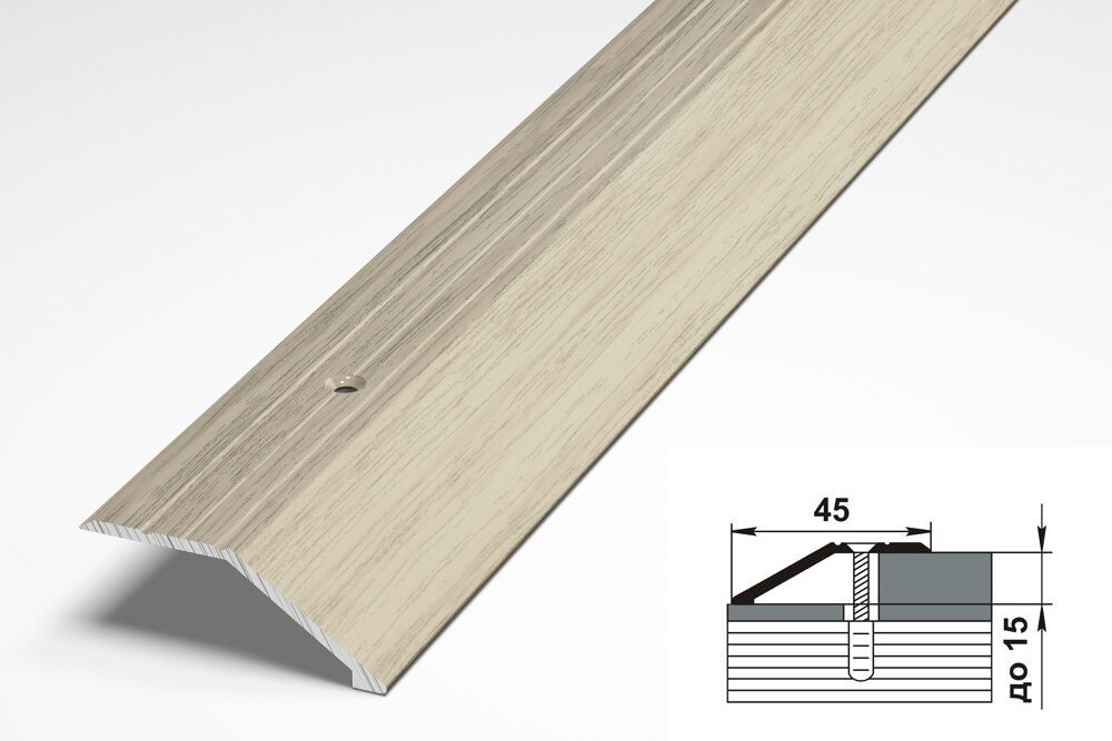 Порог напольный разноуровневый, ширина 45мм, перепад 15мм, длина 0,9м, профиль-порожек алюминиевый лука ПР 04.900.087 (Дуб белёный)