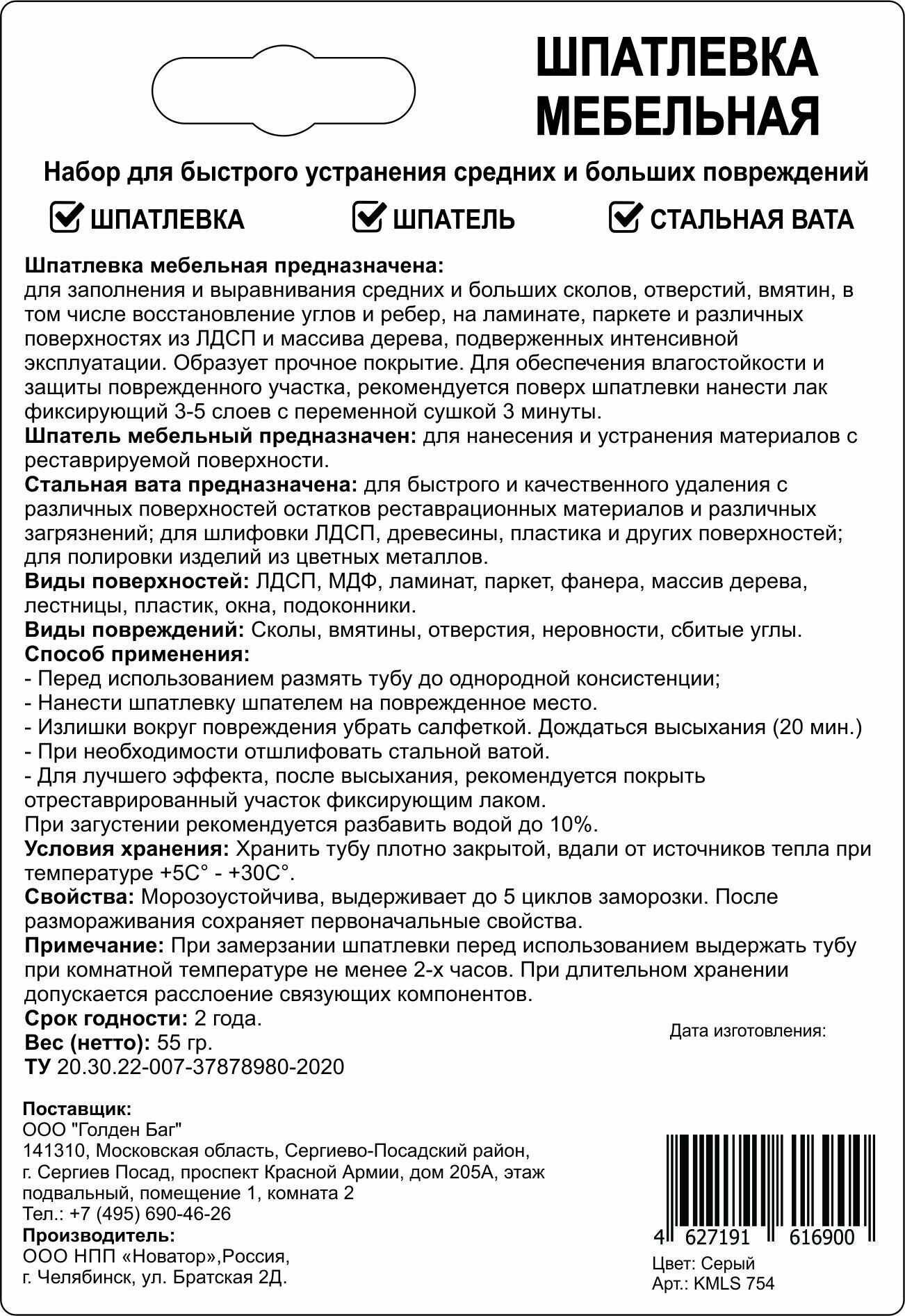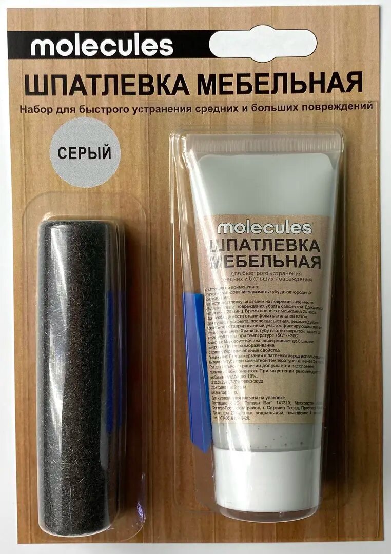 | Дополнительная информация | Шпатлевка мебельная со шпателем Molecules 55 г цвет серый |