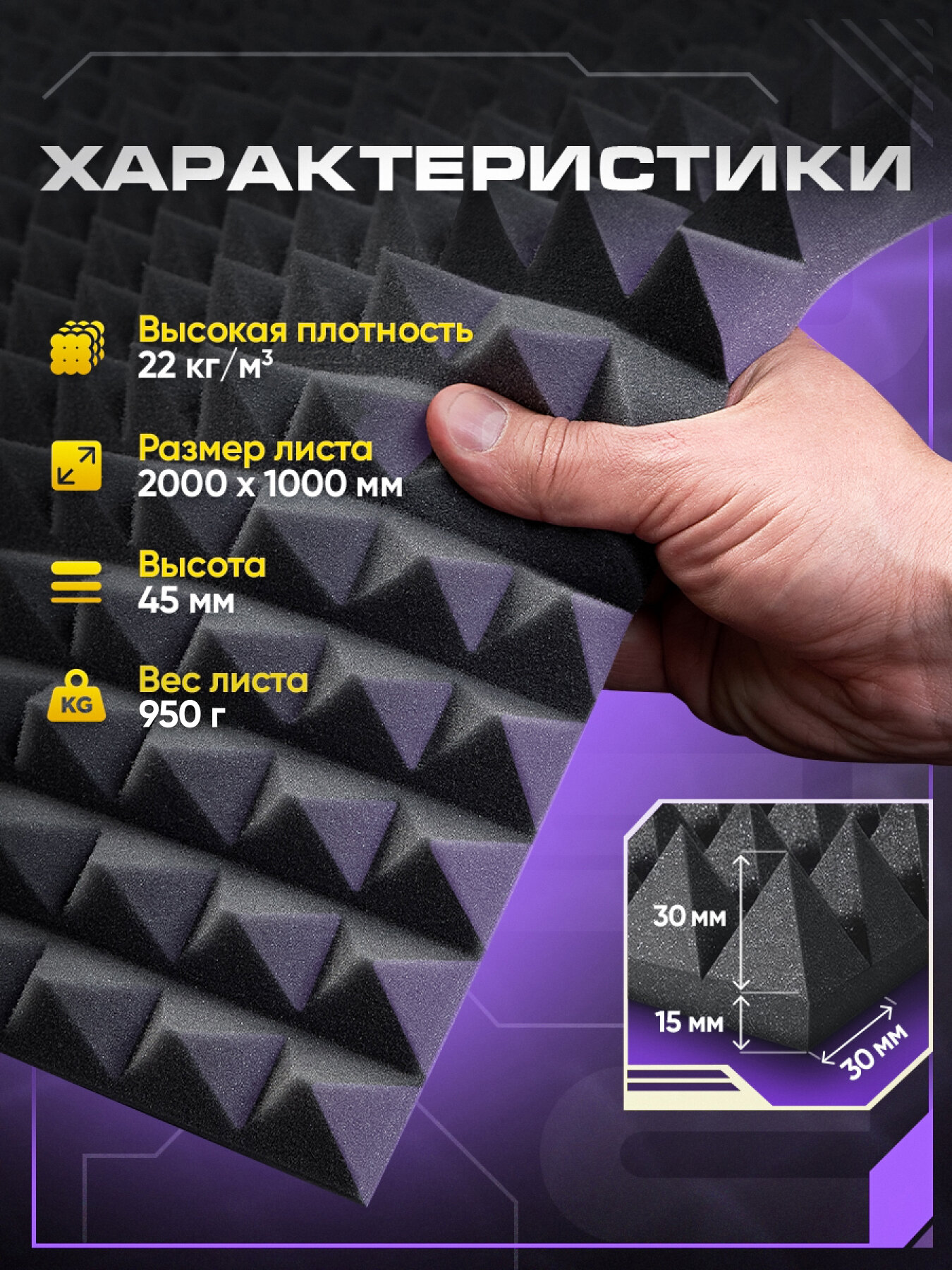 | Подробная комплектация | Акустический поролон пирамида, 1 лист 1000х1000х45 мм |