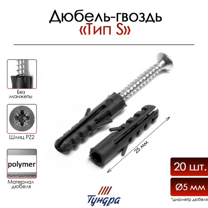 Дюбель-гвоздь "тундра", распорный, тип S, полипропиленовый, без манжеты, 5х25 мм, 20 шт