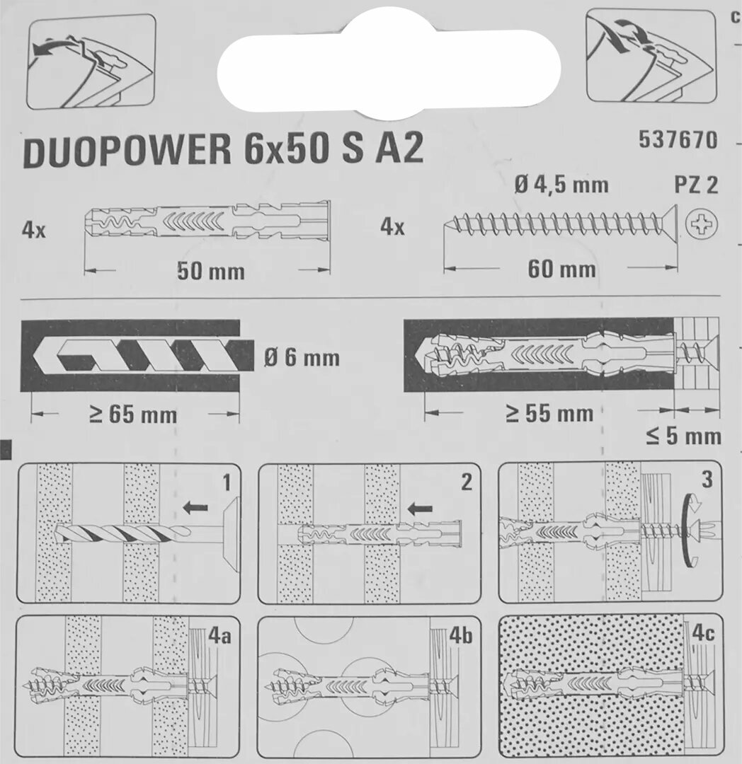 Дюбель универсальный Fischer_de DUOPOWER 6x50 с саморезом нерж. А2 ( 4шт упак.)