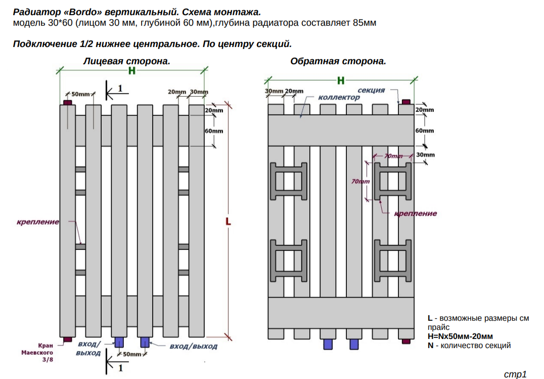 | Подробная комплектация | Радиатор, 2 крана Маевского, 4 кронштейна крепления, транспортировочные заглушки, паспорт изделия, гарантийный талон. |