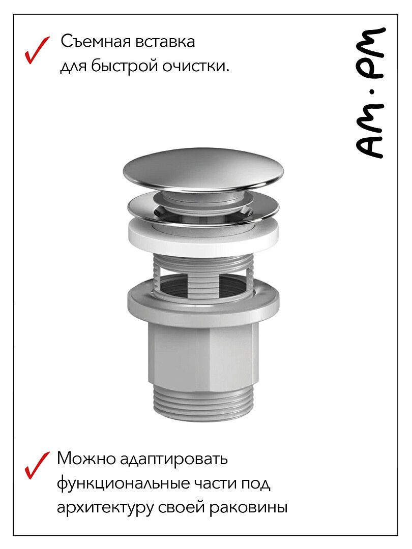 Купить Донный клапан для раковины AM.PM F0700P33 белый, нажимной универсальный, с регулировкой по высоте, ABS пластик, нержавеющая сталь, Германия