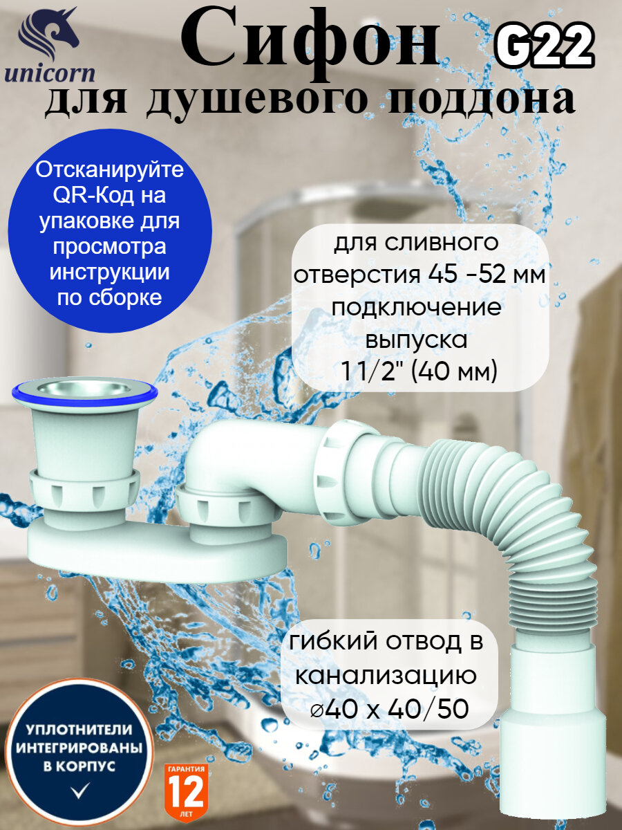 Гофрированный сифон для душевого поддона, для ванны unicorn G22