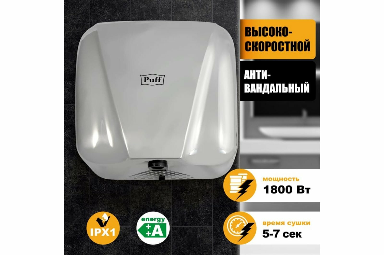 Puff Электросушитель для рук 8800C, антивандальный, хром,1,8 кВт, 35х36х21.5 см 1401.392