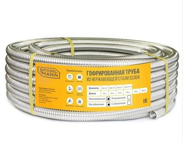 Труба гофрированная из нержавеющей стали SS304 для воды, отопления, теплообменника Stahlmann 20А, отожженная, 25 метров