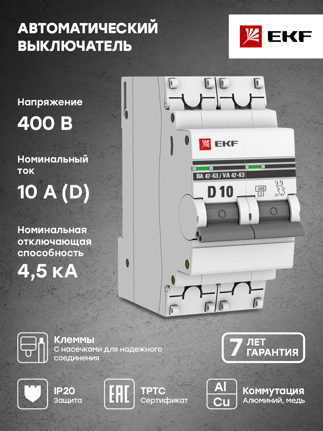 Автоматический выключатель EKF PROxima ВА 47-63 2Р 10А тип D 4,5 кА 660 В на DIN-рейку (mcb4763-2-10D-pro)