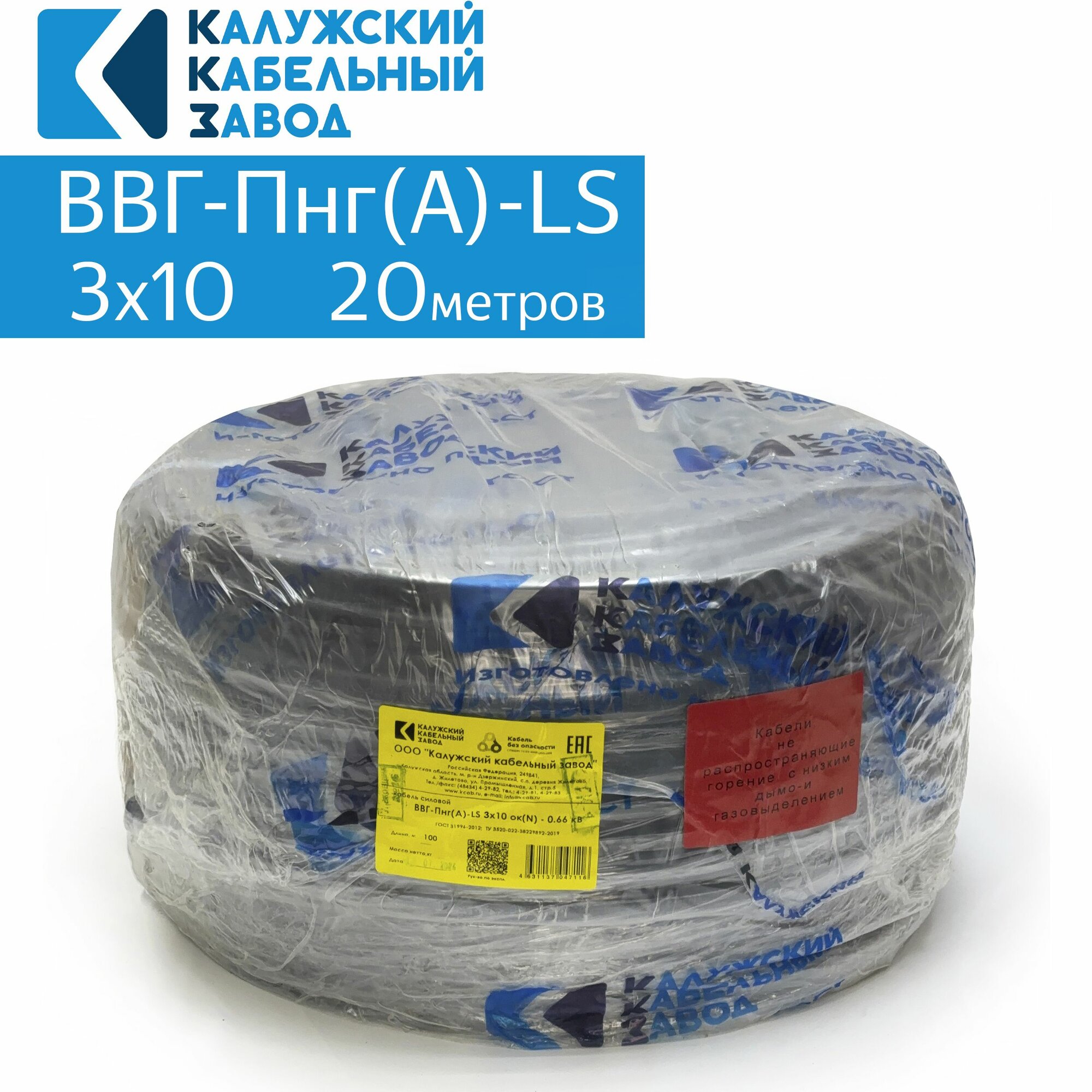 Кабель силовой ВВГ-Пнг(А)-LS 3х10 ГОСТ. 20 метров. Кaлyжcкий кабельный зaвoд