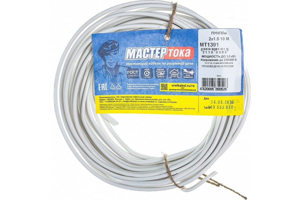 Провод"Мастер Тока" пунпбм, сечение 2х1.5 мм2, 10 м, белый МастерТока 5145641 интересное: