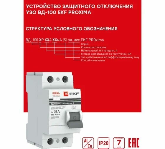 Устройство защитного отключения селективное 4P 25А/100мА (электромеханическое) PROxima, EKF ELCB425100SEMPRO (1 шт.)
