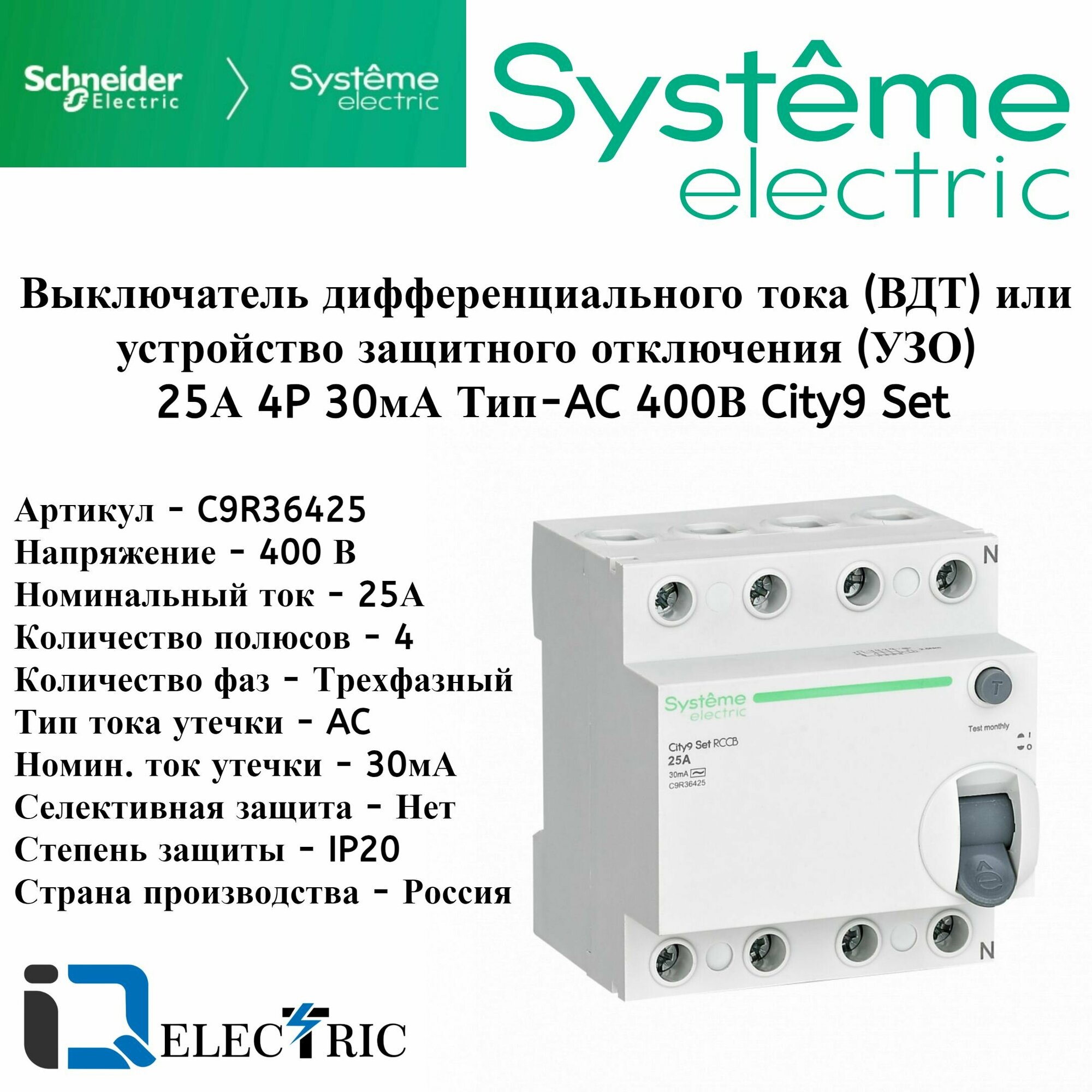 Купить Устройство защитного отключения (УЗО) Systeme Electric (schneider Electric) 4п 25А 30мА тип AC City9 Set, 400В, C9R36425