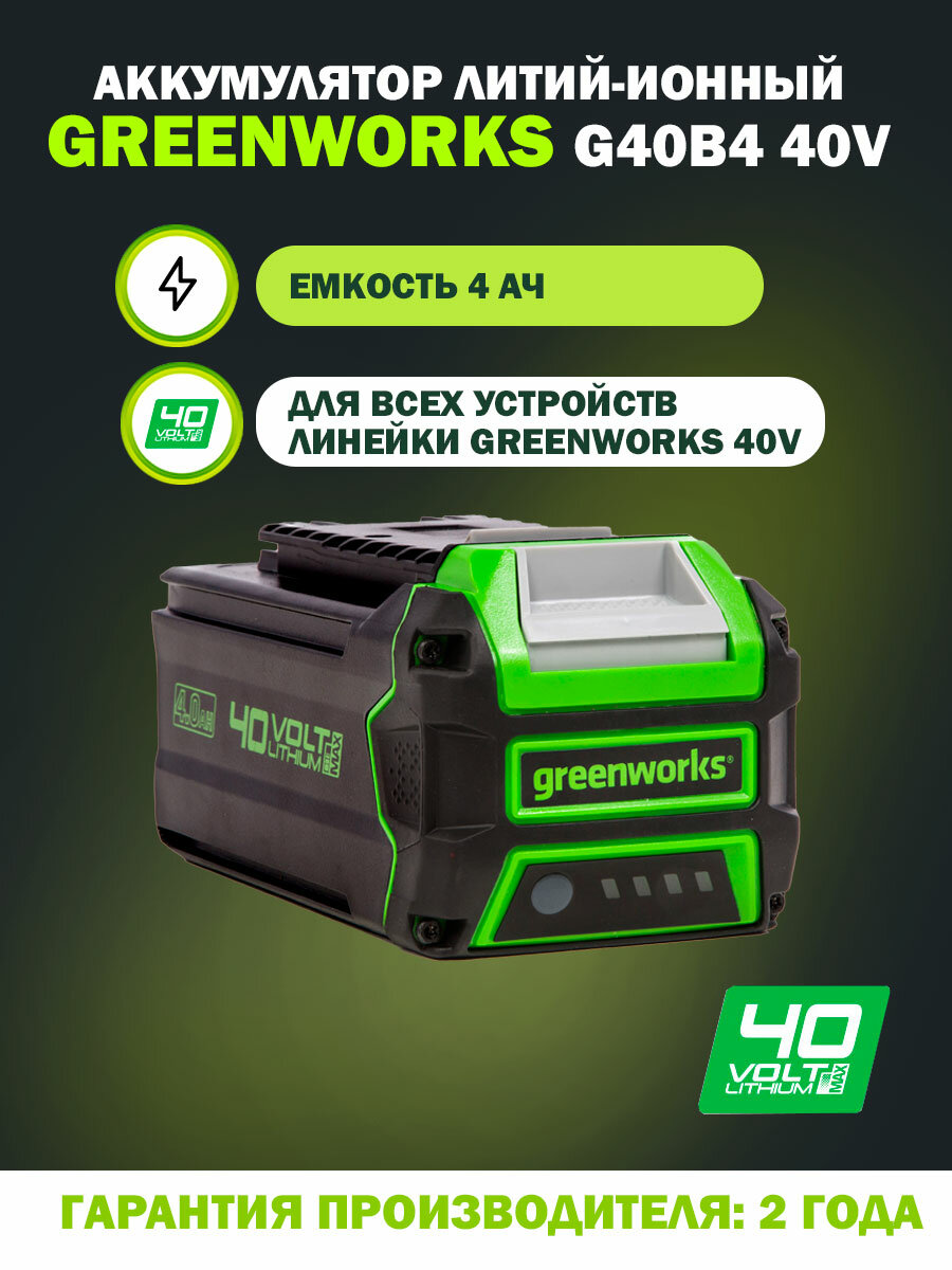 Аккумулятор Greenworks G40B4 2927007, Li-Ion, 40 В, 4 А·ч, 1 шт.