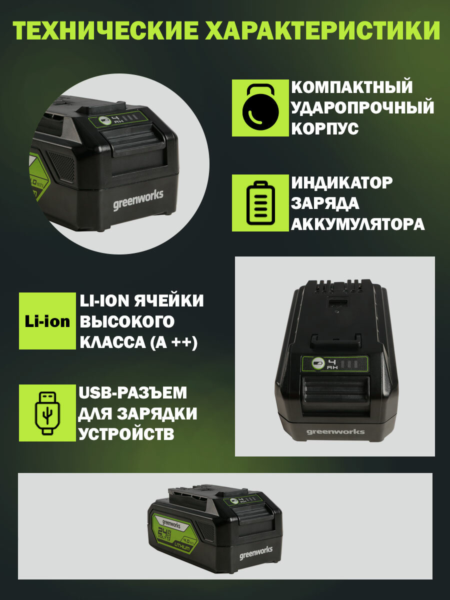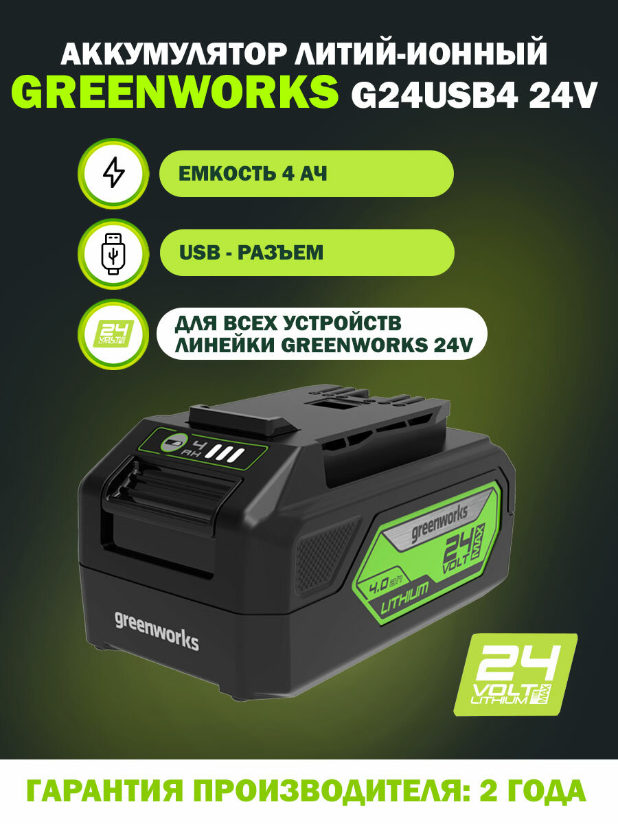 Аккумулятор с USB разъемом GreenworksАрт. 2939307, 24V, 4 Ач интересное: