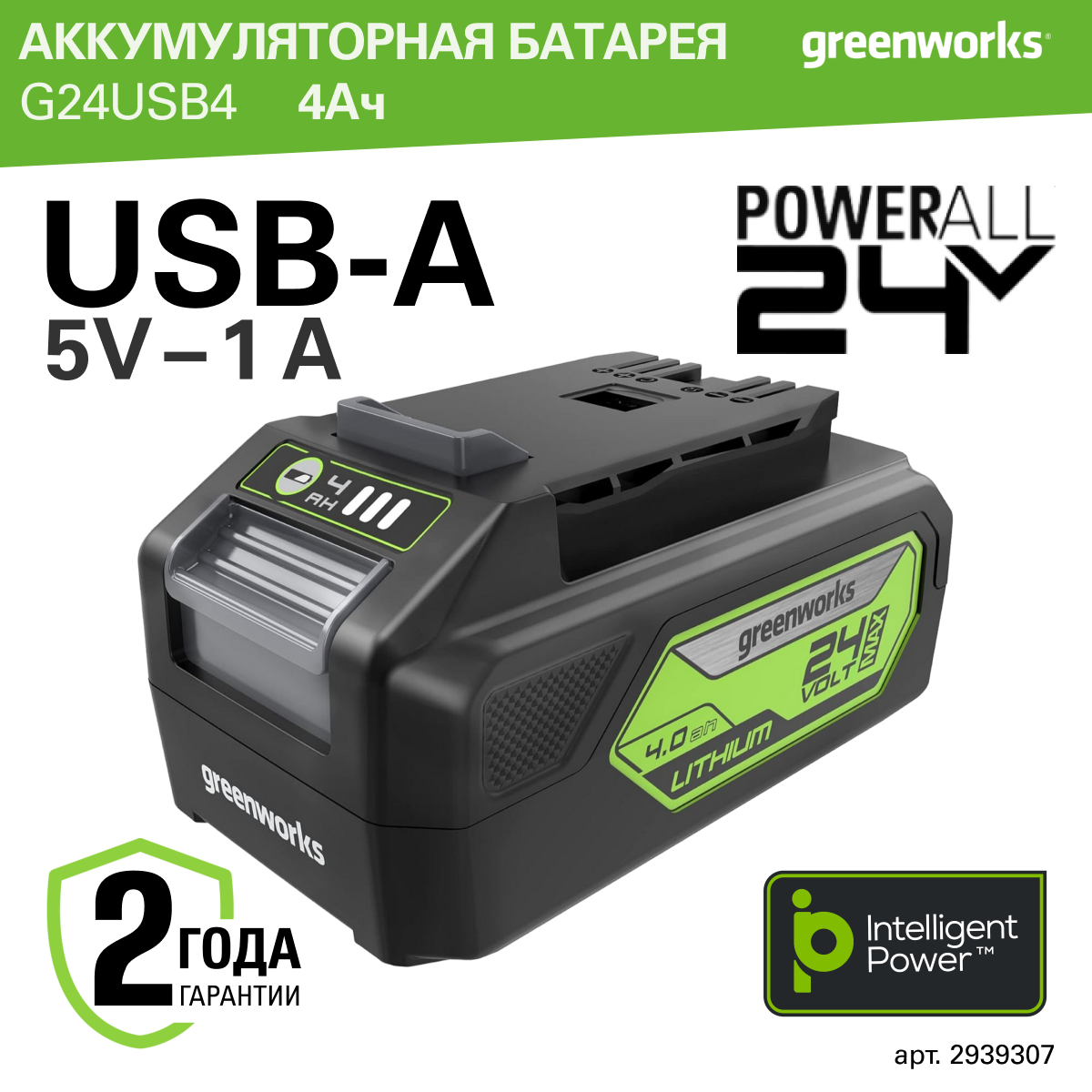 Аккумулятор Greenworks G24USB4, 24V, 4 Ач с USB разъемом (батарейка 2939307)
