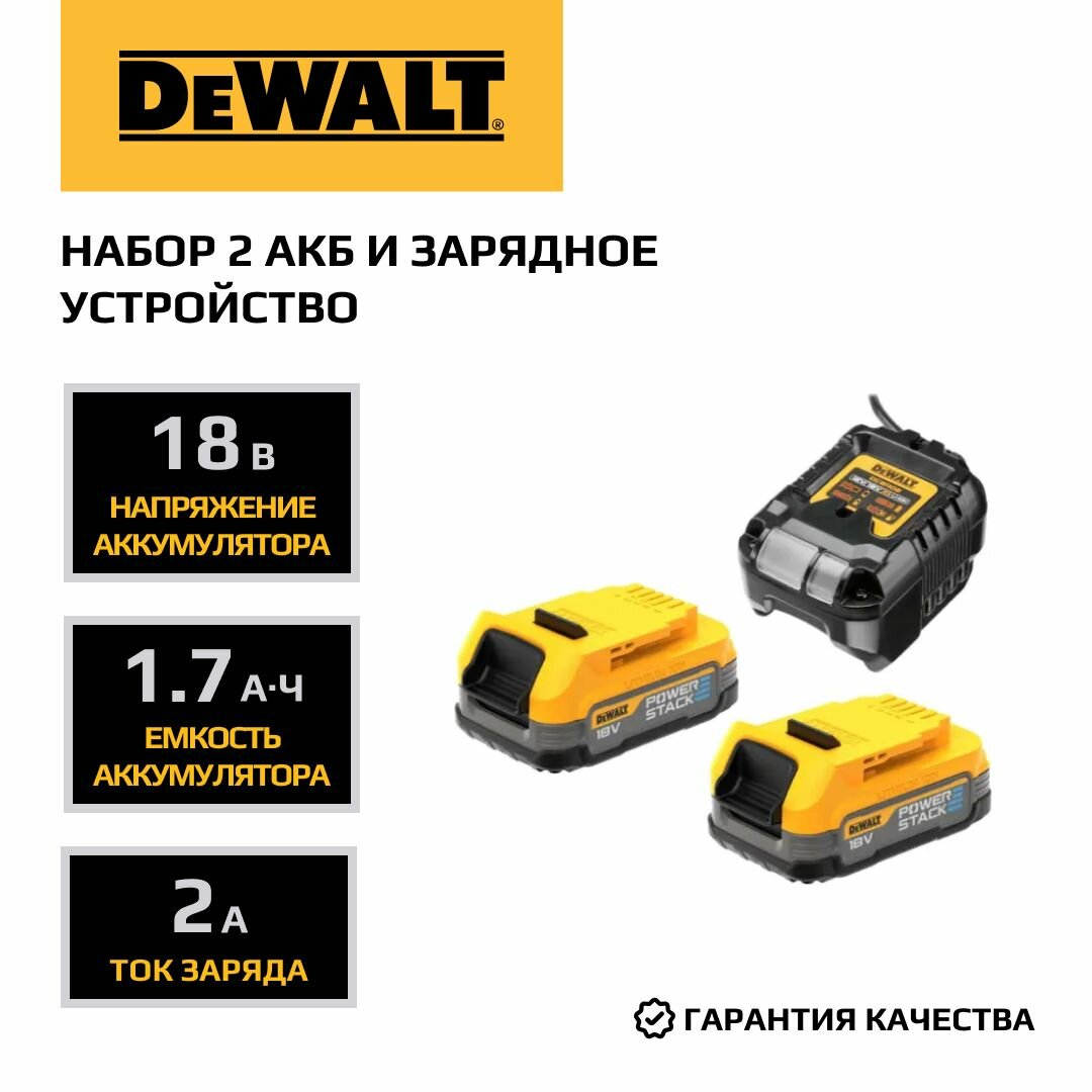 Набор DEWALT: 2 АКБ DCBP034, Li-Ion, 18V XR, 1.7 Ач и зарядное устройство DCB1102, 18 В, DCB1102E2-QW