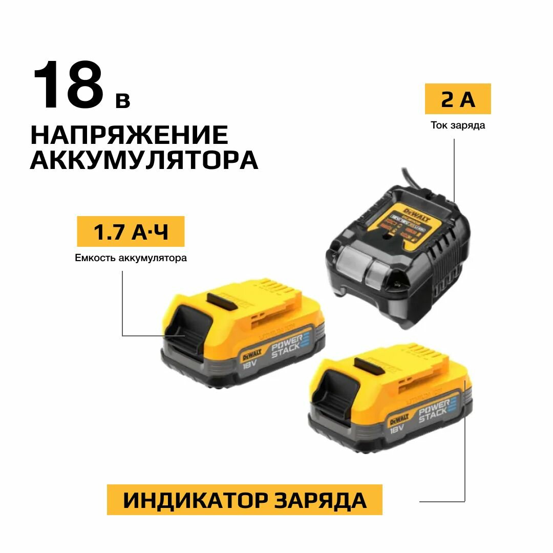 Набор DEWALT: 2 АКБ DCBP034, Li-Ion, 18 В XR, 1.7 Ач и зарядное устройство DCB1102, 18 В, 2 A, DCB1102E2 интересное: