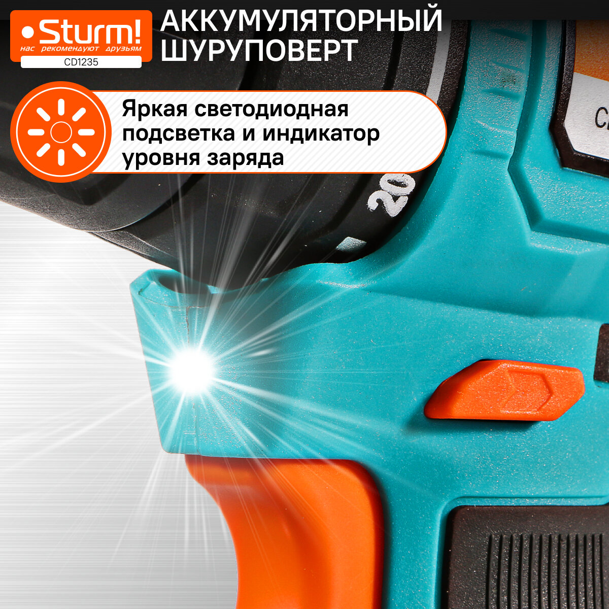 Шуруповёрт аккумуляторный Sturm! CD1235, аккумулятор 12В 2Ач, 35 Нм, LED-подсветка