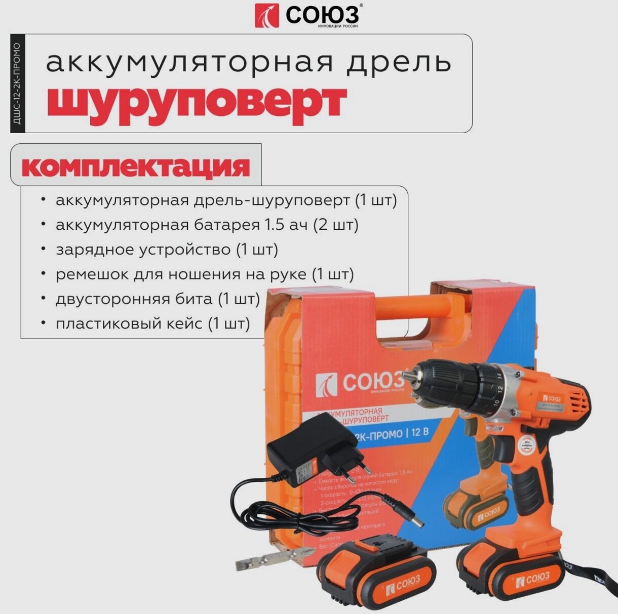 Аккумуляторный шуруповерт Союз ДШС-12/2К-Промо