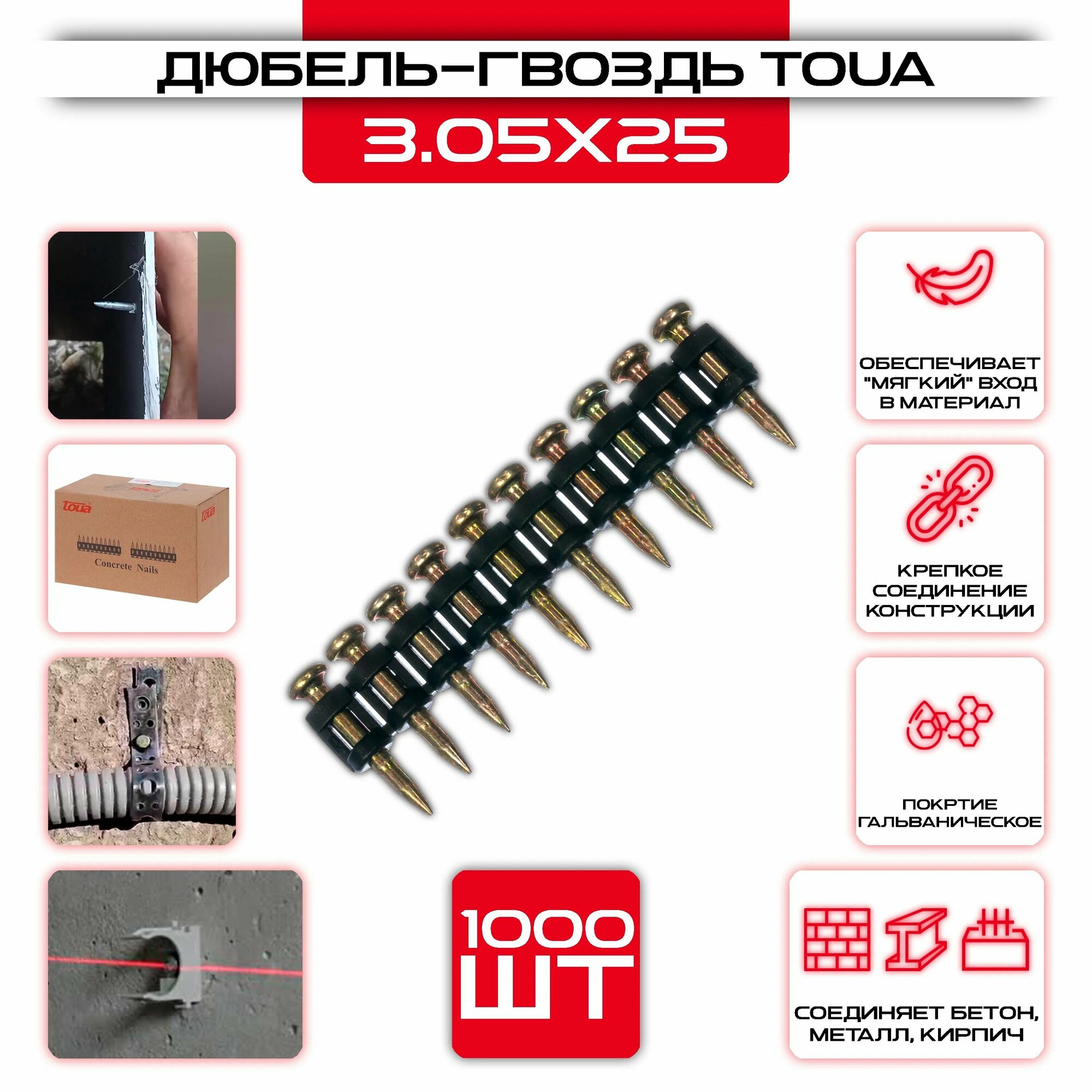| Дополнительная информация | Дюбель-гвозди по бетону, металлу, кирпичу; усиленный, гальванизированный |