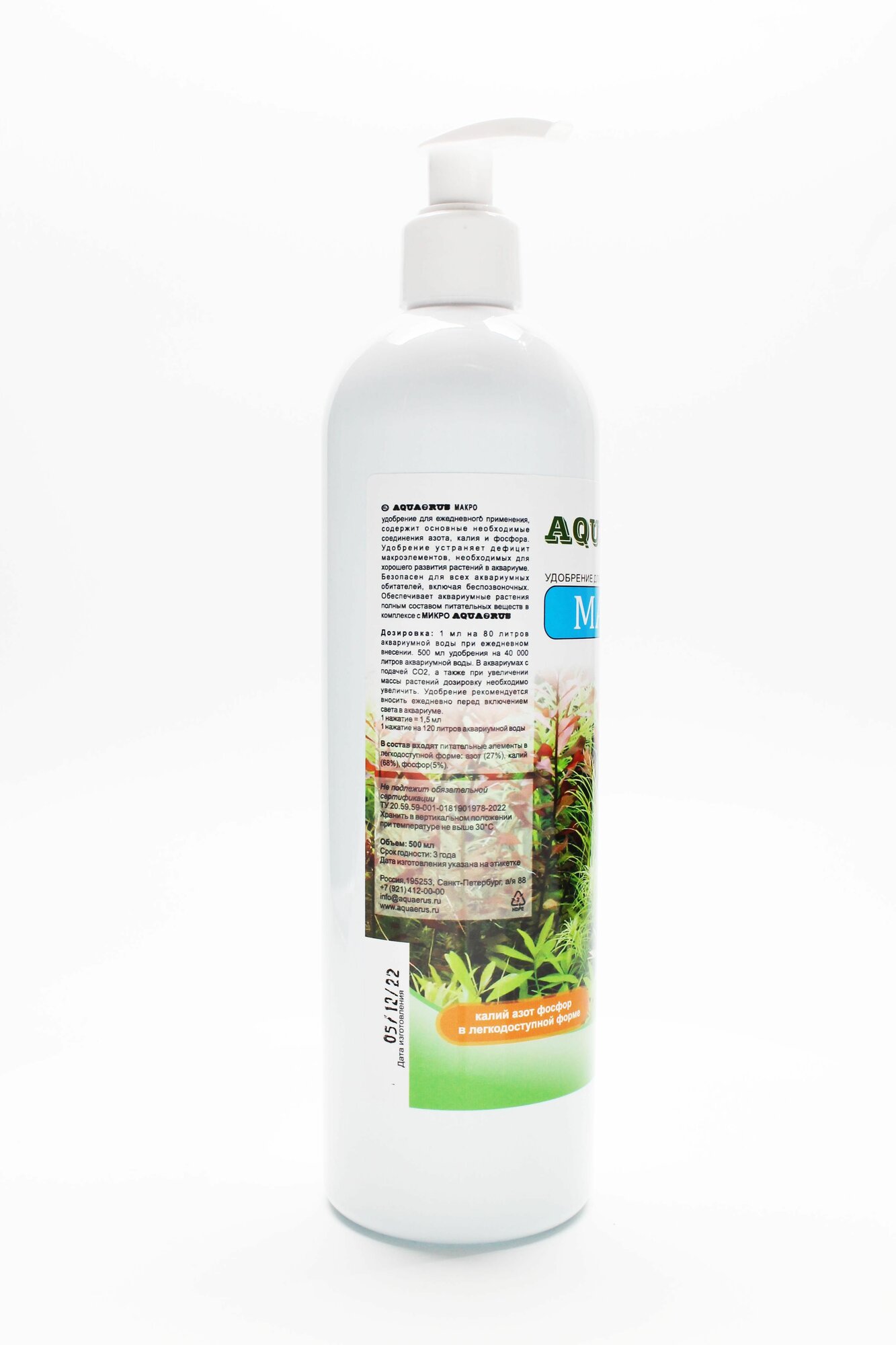 Удобрение для аквариума AQUAERUS Макро, для аквариумных растений, содержит NPK, 500 мл