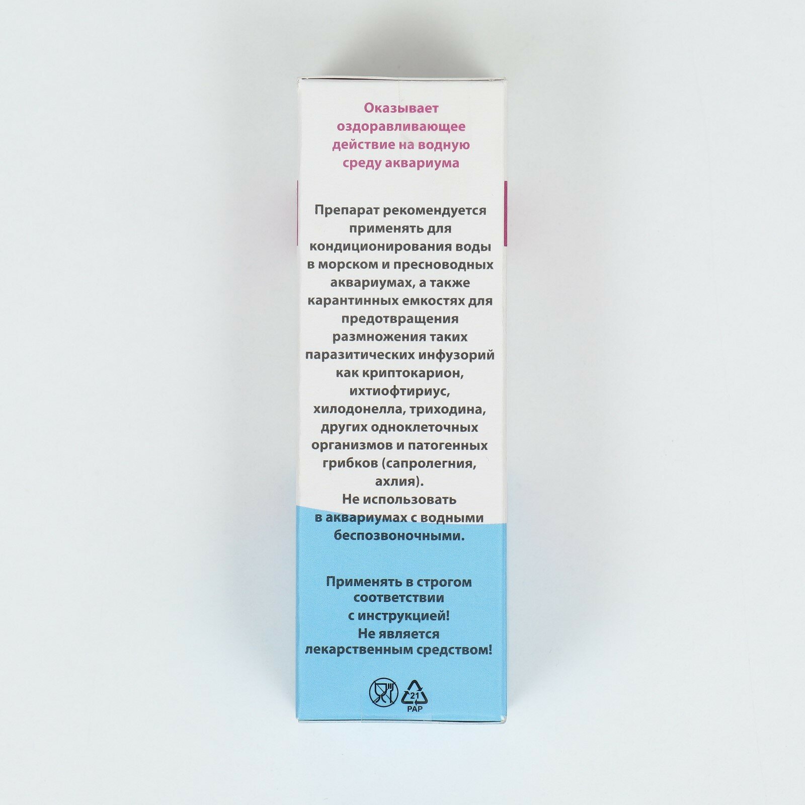 | Способ применения | непосредственно перед внесением кондиционера в аквариум следует заменить 30% воды и только после этого вносить кондиционер. В качестве подменной воды надо использовать отстоянную в течение не менее суток водопроводную воду; в аквариумах с мягкой водой перед подменой следует измерить рН, если значения этого показателя в аквариуме и в подменной воде различаются более, чем на одну единицу, то частичная замена воды осуществляется в два этапа с интервалом в 3-5 часов; сначала следует подменить 20% воды, потом еще 20-30% |