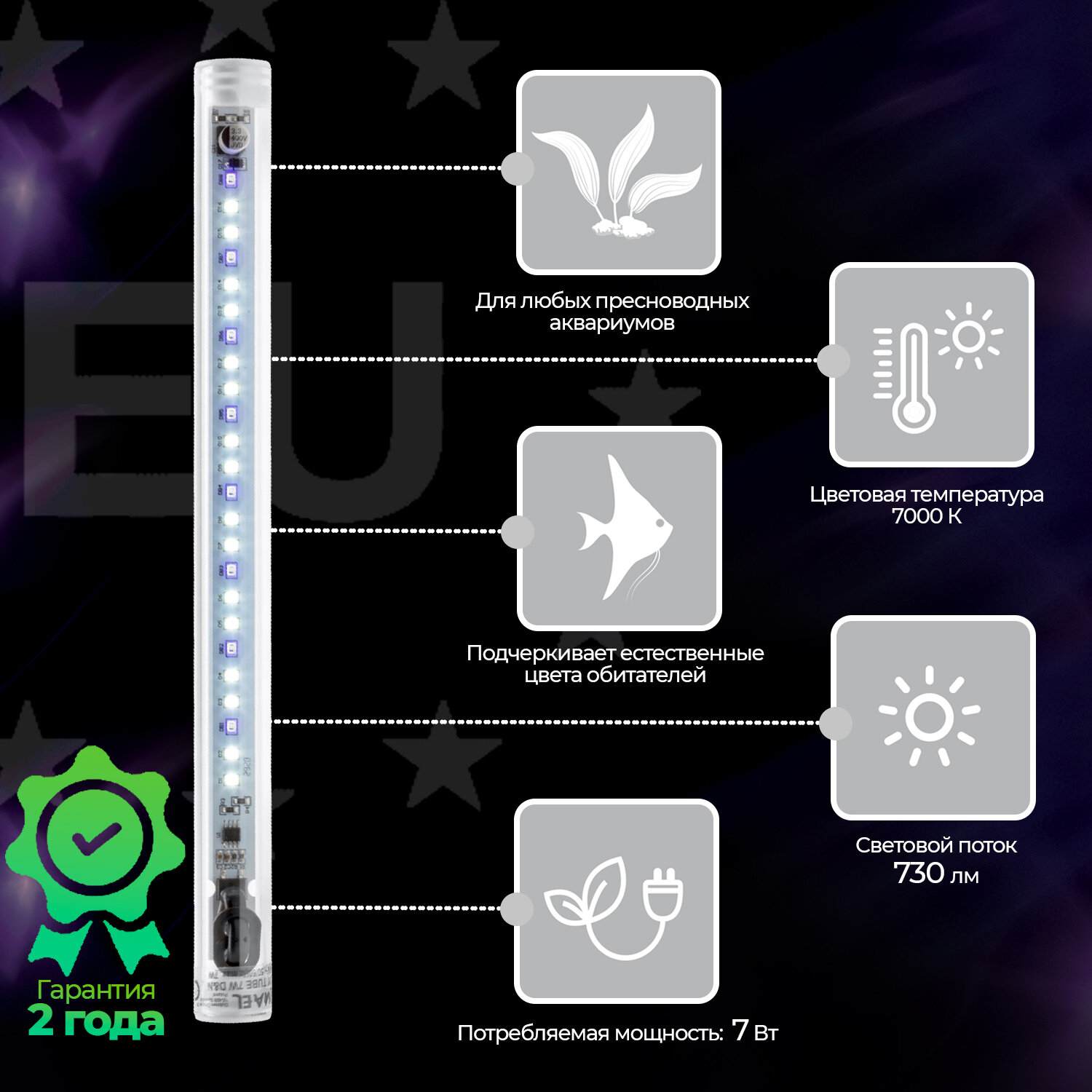 | Дополнительная информация | Три режима освещения можно переключать на шнуре питания: рассвет / daybreak — рекомендуется в качестве первого режима после ночного перерыва или при кормлении рыб, характеризуется пониженной интенсивностью; день / day — максимально приближенный к солнечному, подчеркивает естественный окрас всех обитателей аквариума ночь / night — для оформления аквариумов с флуоресцирующими рыбами и декорациями (светятся в синем спектре) и для детской комнаты (на время сна ребенка, который боится засыпать в темноте). |
