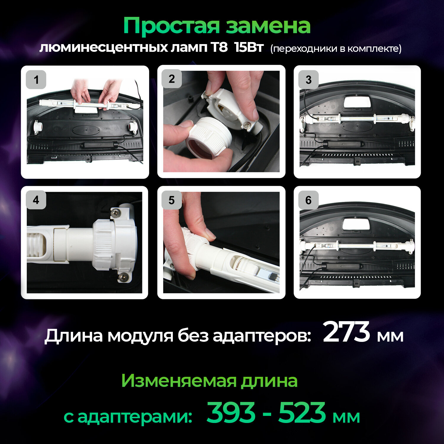 | Подробная комплектация | 1. Модуль освещения, 2. Комплект адаптеров для Т5 ламп (2 шт.), 3. Комплект адаптеров для Т8 ламп (2 шт.), 4. Комплект корпус-держателей ламп (2 шт.), 5. Инструкция с гарантийным талоном. |