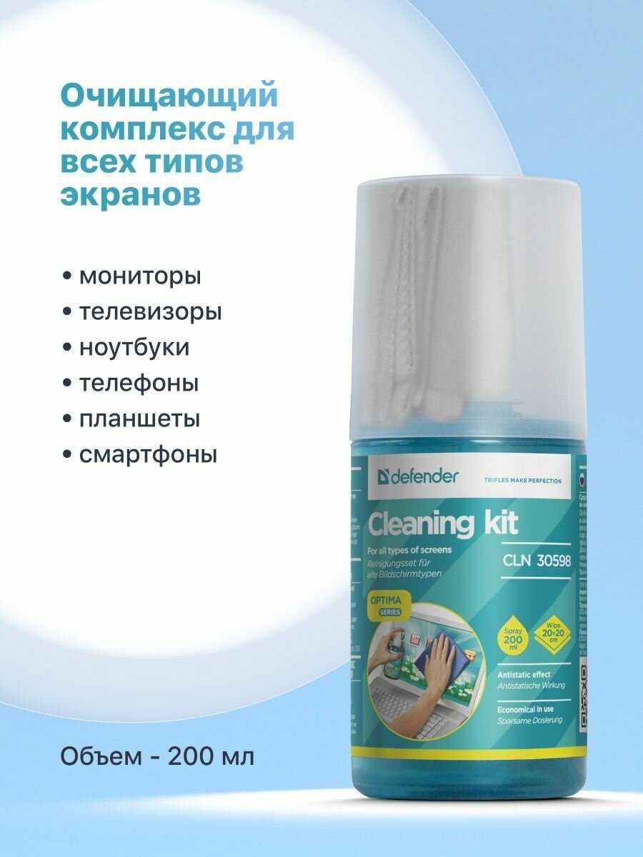 Очищающий комплекс: салфетка из микрофибры + чистящее средство Defender CLN Optima 200 мл , для экрана , монитора , телефона , оптики и стекол интересное: