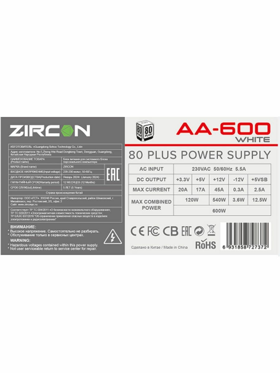 Блок питания ATX ZIRCON AA-600 White 80+ (Белый 600W 20+4pin 4+4pin 2*6+2pin 5*SATA 3*MOLEX вентилятор 120мм)