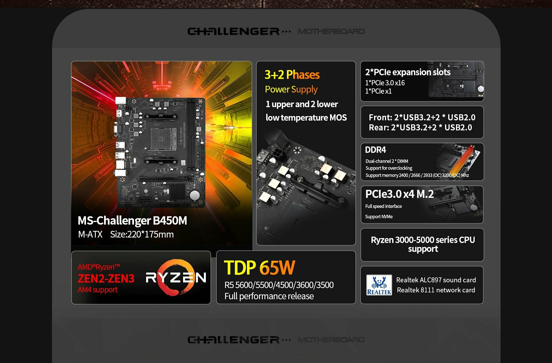 Материнская плата Maxsun MS-Challenger B450m Am4, B450, 2xDDR4, 1xPCI-E 16X1xPCI-E 1X1xM.2, Front2xU интересное: