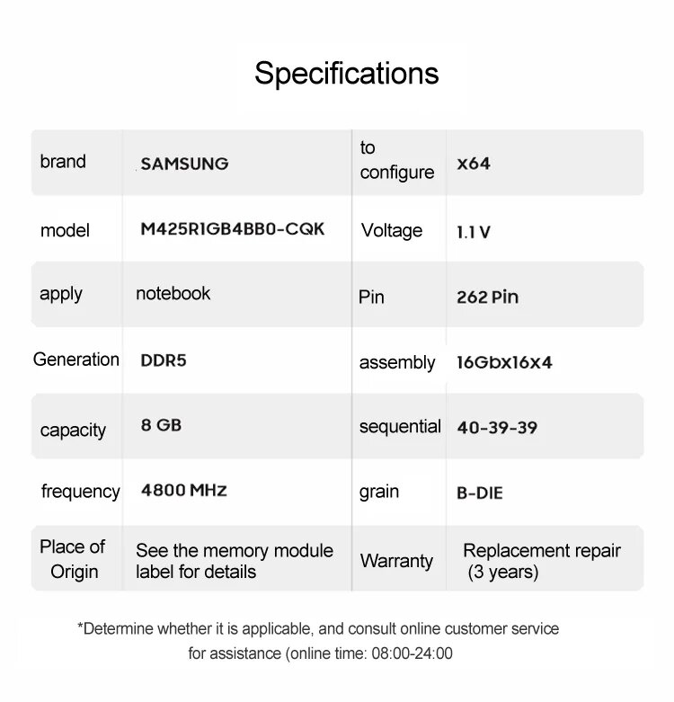 Модуль оперативной памяти Samsung SO-DIMM DDR5 8ГБ PC5-38400, 4800MHz 1.1V, CL40, M425R1GB4BB0-CQK0L OEM