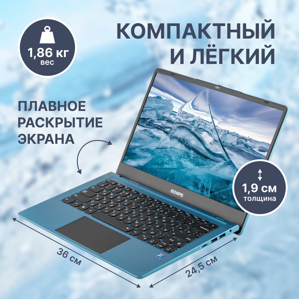 Ноутбук для работы и учебы 14.1" Echips Arctic, Intel Processor N100, RAM 8 ГБ, SSD 256 ГБ, Intel UHD Graphics, Windows Home, синий, Русская раскладка, с подсветкой клавиатуры
