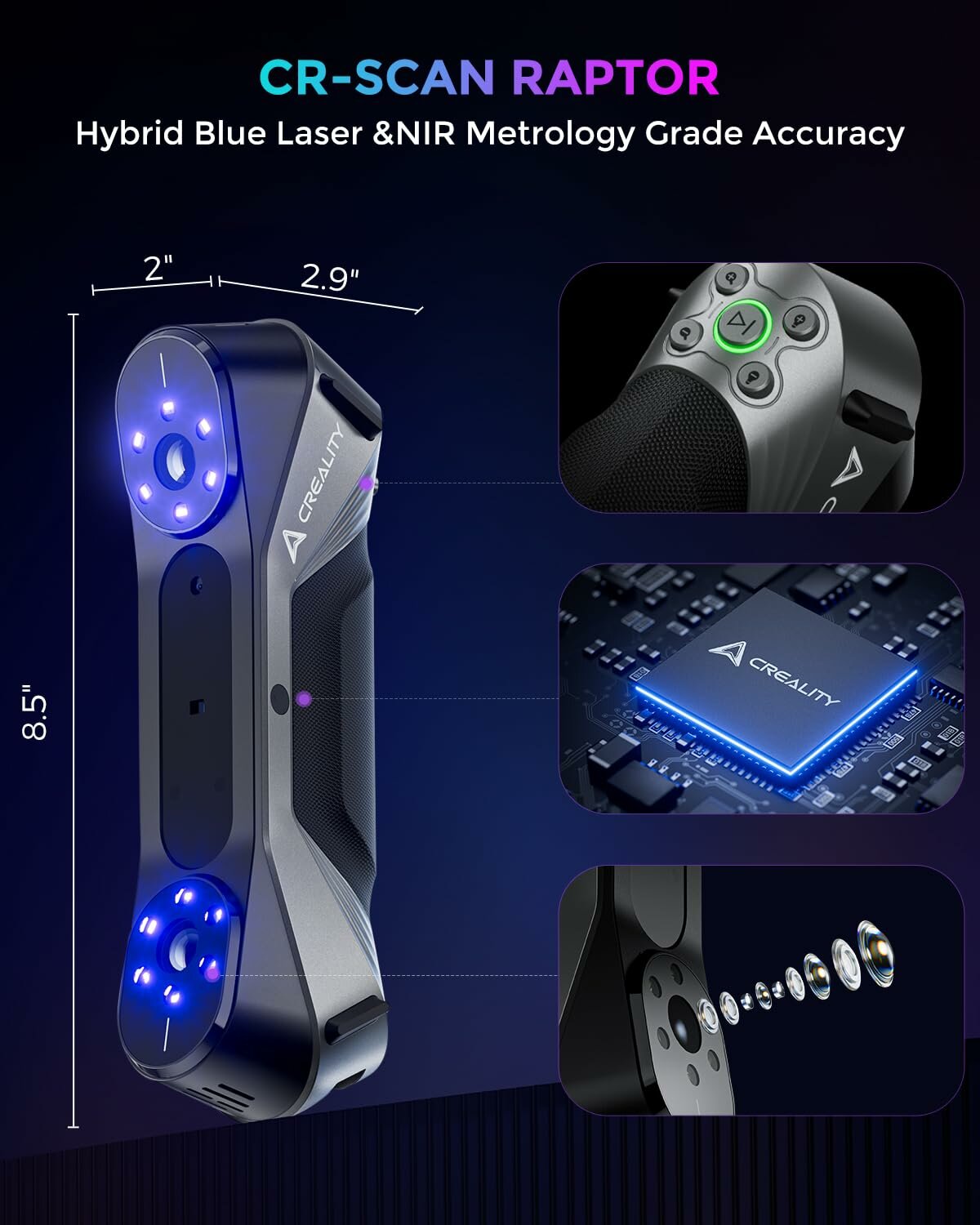 3D-сканер Creality CR-Scan Raptor для 3D-печати. Ручной сканер с точностью 0,02 мм. Синий свет, отслеживание стабилизации. Скорость сканирования до 60 кадров в секунду для объектов размером 5–2000 мм для Windows Mac.