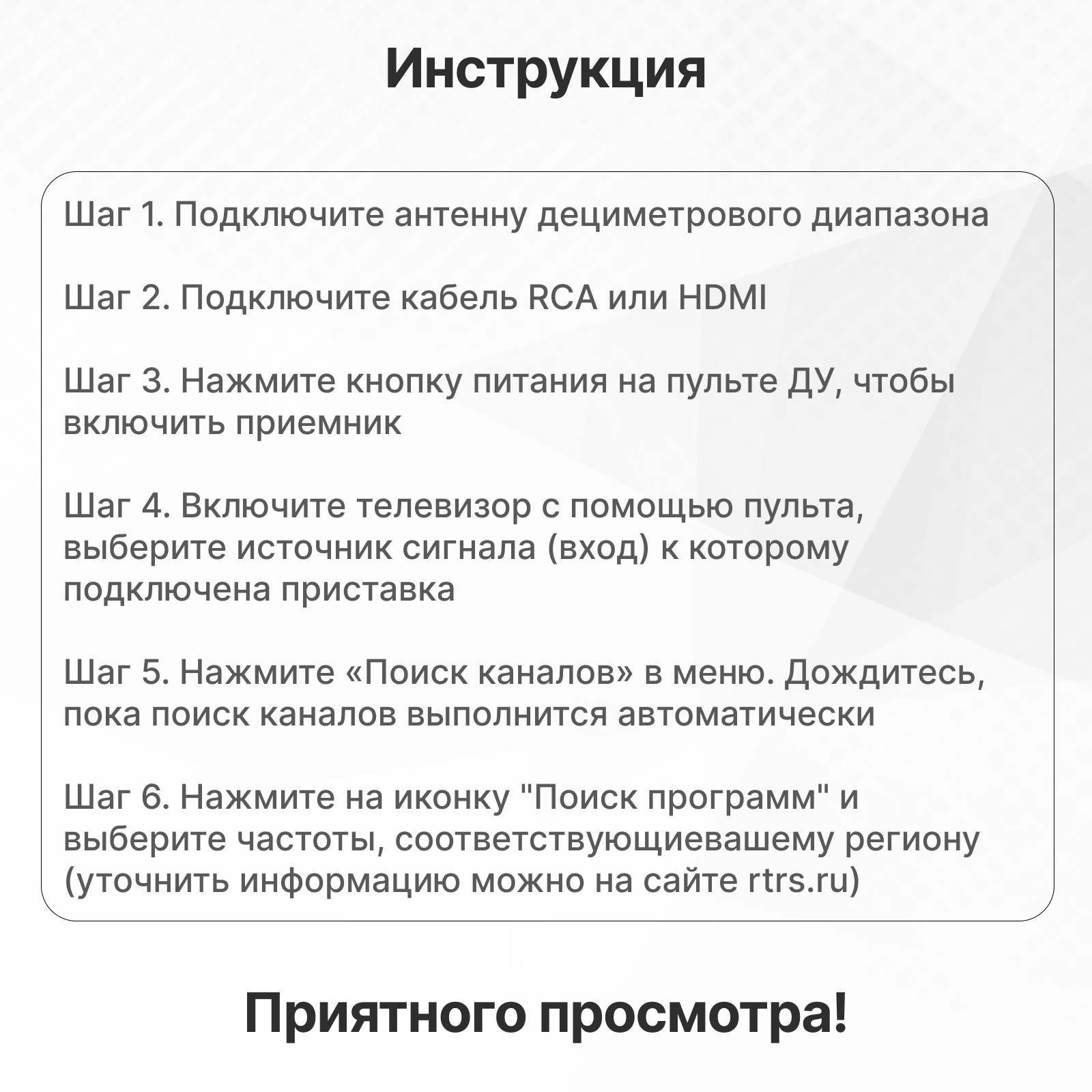 | Комплектация | Цифровой эфирный приемник Cadena CDT-2291SB – 1шт., Пульт ДУ – 1 шт., Блок питания DC5В/1,5А – 1шт., Элемент питания 1,5В AAA – 2 шт., Шнур 3RCA-3RCA - 1шт., Руководство пользователя – 1 шт., Гарантийный талон – 1шт.. |