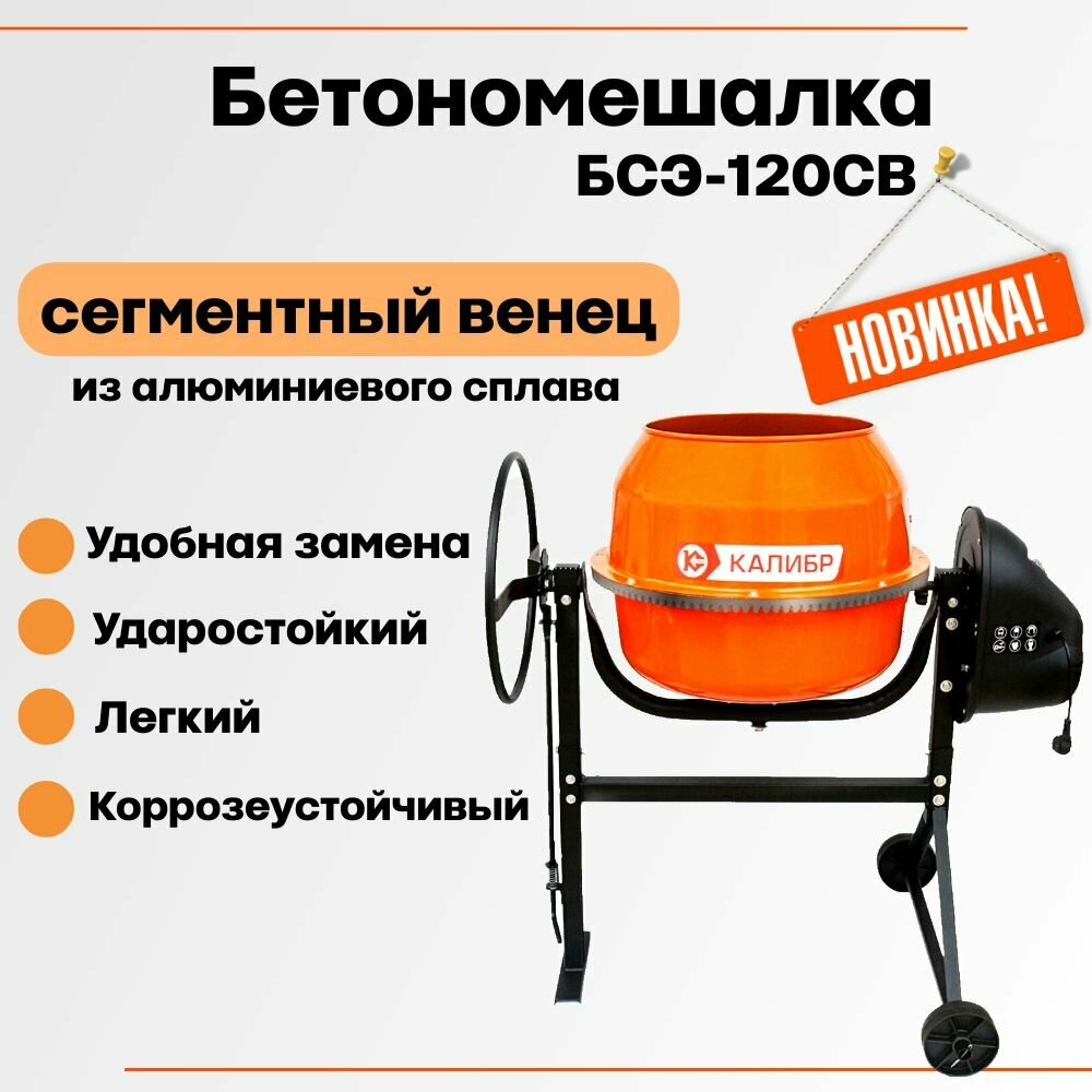 Бетоносмеситель Калибр БСЭ-120СВ сегментный венец из алюминиевого сплава, объем 120 литров, мощность 600 Вт, бетономешалка строительная интересное: