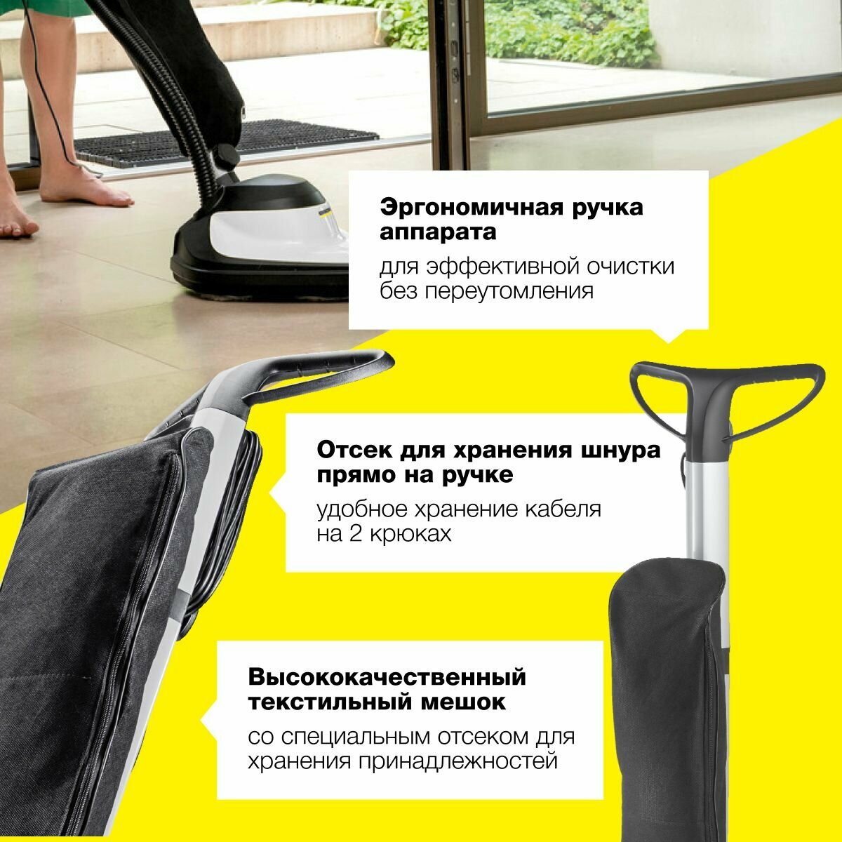 | Дополнительная информация | Крепления для кабеля; поворотная ручка; высококачественный текстильный мешок со специальным отсеком для хранения принадлежностей |