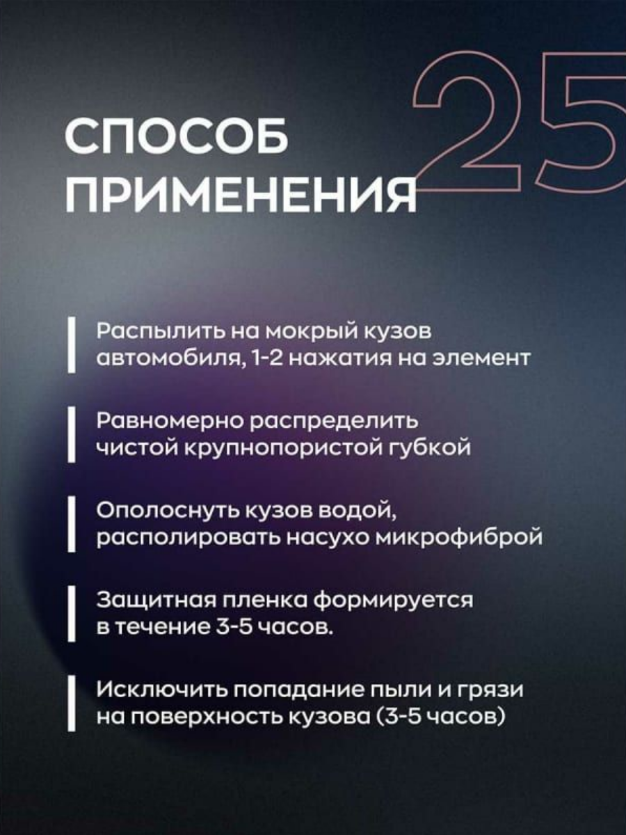 | Способ применения | Перед применением тщательно перемешать. Не наносить на недомытую поверхность! Распылить средство на мокрую чистую поверхность автомобиля при помощи триггера (1 распыление на 1 деталь), и равномерно распределить чистой крупнопористой губкой. Ополоснуть кузов водой, располировать насухо замшевой тряпкой или микрофиброй. |