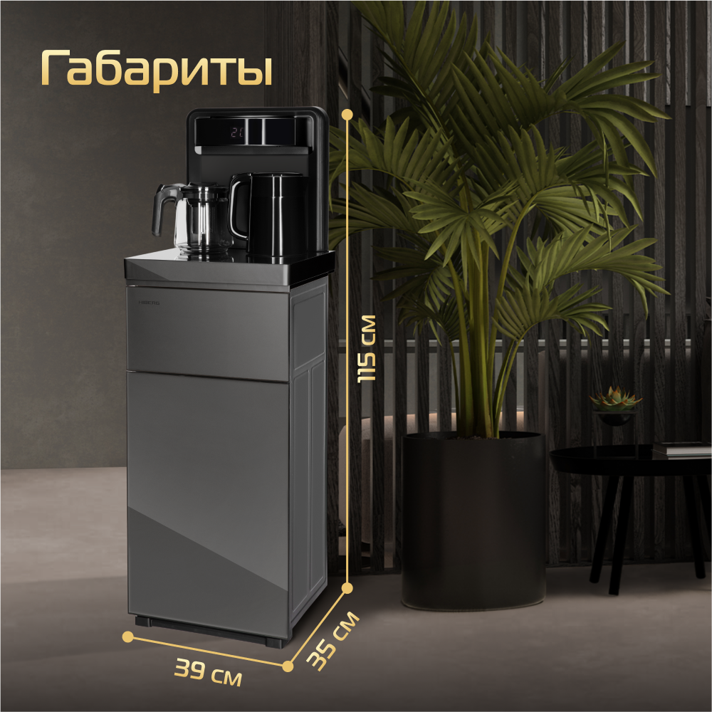 Кулер для воды HIBERG UF 95 Grey напольный, электронное охлаждение, столешница с двумя чайниками, нижняя загрузка бутыли, сенсорное управление, цвет серый